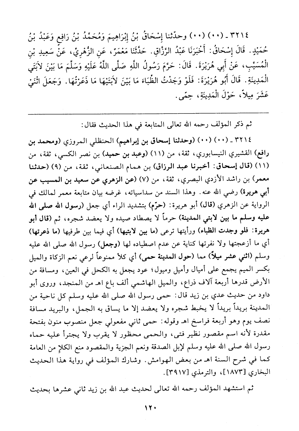 ٣٢١٤ - (٠٠) (٠٠) (وحدثنا إسحاق بن إبراهيم) الحنظلي المروزي (ومحمد بن رافع) القشيري النيسابوري، ثقة، من (١١) (وعبد بن حميد) بن نصر الكسي، ثقة، من (١١) (قال إسحاق: أخبرنا عبد الرزاق) بن همام الصنعاني، ثقة، من (٩) (حدثنا معمر) بن راشد الأزدي البصري، ثقة، من (٧) (عن الزهري عن سعيد بن المسيب عن أبي هريرة) رضي الله عنه. وهذا السند من سداسياته، غرضه بيان متابعة معمر لمالك في الرواية عن الزهري (قال) أبو هريرة: (حرّم) بتشديد الراء أي جعل (رسول الله صلى الله عليه وسلم ما بين لابتي المدينة) حرمًا لا يصطاد صيده ولا يعضد شجره، ثم (قال أبو هريرة: فلو وجدت الظباء) ورأيتها ترعى (ما بين لابتيها) أي فيما بين طرفيها (ما ذعرتها) أي ما أزعجتها ولا نفرتها كناية عن عدم اصطياده لها (وجعل) رسول الله صلى الله عليه وسلم (اثني عشر ميلًا) مما (حول المدينة حمى) أي كلأ ممنوعًا لرعي نعم الزكاة والميل بكسر الميم يجمع على أميال وأميل وميول؛ عود يجعل به الكحل في العين، ومسافة من الأرض قدرها أربعة آلاف ذراع، والميل الهاشمي ألف باع اهـ من المنجد، وروى أبو داود من حديث عدي بن زيد قال: حمى رسول الله صلى الله عليه وسلم كل ناحية من المدينة بريدًا بريدًا لا يخبط شجره ولا يعضد إلا ما يساق به الجمل، والبريد مسافة نصف يوم وهو أربعة فراسخ اهـ وقوله: حمى ثاني مفعولي جعل منصوب منون بفتحة مقدرة لأنه اسم مقصور نظير فتى، والحمى محظور لا يقرب ولا يجترأ عليه حماه رسول الله صلى الله عليه وسلم لإبل الصدقة ونعم الجزية والمقصود منع الكلإِ من العامة كما في شرح السنة اهـ من بعض الهوامش. وشارك المؤلف في رواية هذا الحديث البخاري [١٨٧٣]، والترمذي [٣٩١٧].