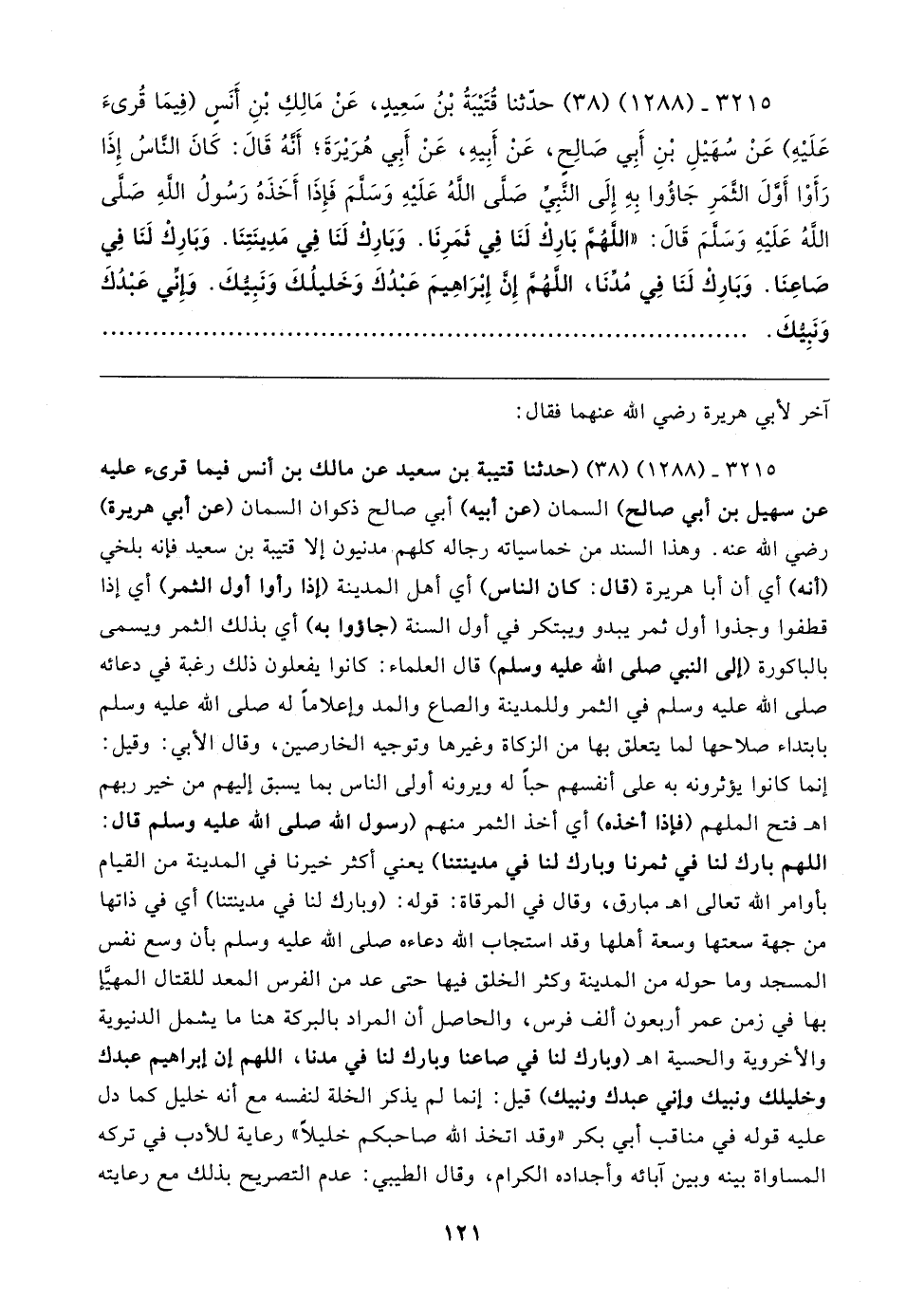 ٣٢١٥ - (١٢٨٨) (٣٨) حدَّثنا قُتَيبَةُ بْنُ سَعِيدٍ، عَنْ مَالِكِ بْنِ أَنَسٍ (فِيمَا قُرئَ عَلَيهِ) عَنْ سُهيلِ بْنِ أَبِي صَالِحٍ، عَنْ أَبِيهِ، عَنْ أَبِي هُرَيرَةَ؛ أَنَّهُ قَال: كَانَ النَّاسُ إِذَا رَأَوْا أَوَّلَ الثَّمَرِ جَاؤُوا بِهِ إِلَى النَّبِيِّ صَلَّى اللهُ عَلَيهِ وَسَلَّمَ فَإِذَا أَخَذَهُ رَسُولُ الله صَلَّى اللهُ عَلَيهِ وَسلَّمَ قَال: "اللَّهُمَّ بَارِكْ لَنَا فِي ثَمَرِنَا. وَبَارِكْ لَنَا فِي مَدِينَتِنَا. وَبَارِكْ لَنَا فِي صَاعِنَا. وَبَارِكْ لَنَا فِي مُدِّنَا، اللَّهُمَ إِنَّ إِبْرَاهِيمَ عَبْدُكَ وَخَليلُكَ وَنَبِيُّكَ. وَإِنِّي عَبْدُكَ وَنَبِيُّكَ