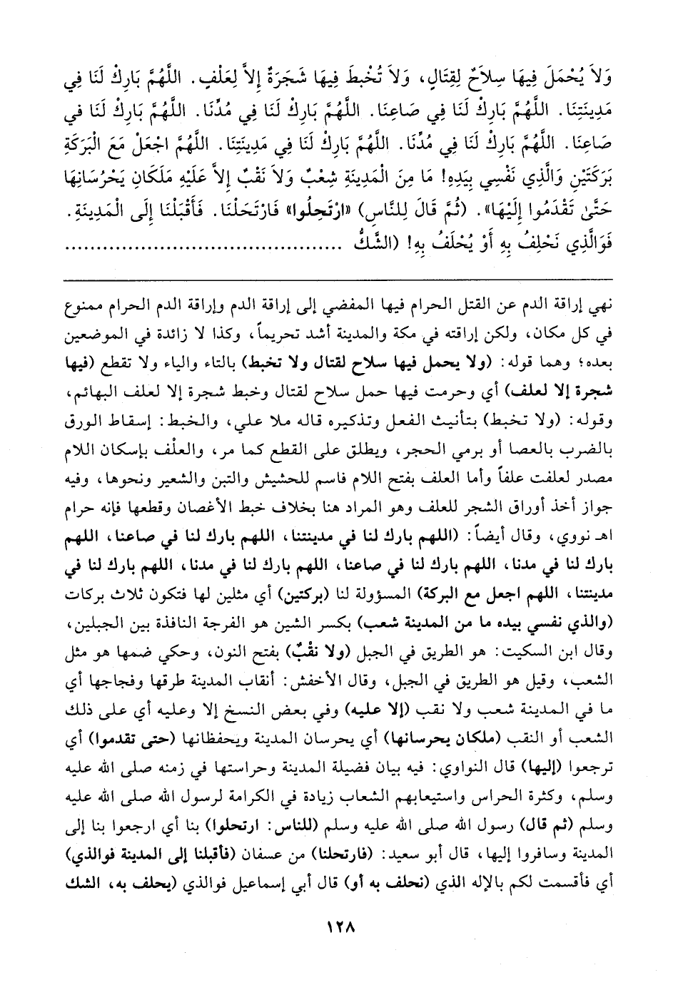 نهي إراقة الدم عن القتل الحرام فيها المفضي إلى إراقة الدم وإراقة الدم الحرام ممنوع في كل مكان، ولكن إراقته في مكة والمدينة أشد تحريمًا، وكذا لا زائدة في الموضعين بعده؛ وهما قوله: (ولا يحمل فيها سلاح لقتال ولا تخبط) بالتاء والياء ولا تقطع (فيها شجرة إلا لعلف) أي وحرمت فيها حمل سلاح لقتال وخبط شجرة إلا لعلف البهائم، وقوله: (ولا تخبط) بتأنيث الفعل وتذكيره قاله ملا علي، والخبط: إسقاط الورق بالضرب بالعصا أو برمي الحجر، ويطلق على القطع كما مر، والعلْف بإسكان اللام مصدر لعلفت علفًا وأما العلف بفتح اللام فاسم للحشيش والتبن والشعير ونحوها، وفيه جواز أخذ أوراق الشجر للعلف وهو المراد هنا بخلاف خبط الأغصان وقطعها فإنه حرام اهـ نووي، وقال أيضًا: (اللهم بارك لنا في مدينتنا، اللهم بارك لنا في صاعنا، اللهم بارك لنا في مدنا، اللهم بارك لنا في صاعنا، اللهم بارك لنا في مدنا، اللهم بارك لنا في مدينتنا، اللهم اجعل مع البركة) المسؤولة لنا (بركتين) أي مثلين لها فتكون ثلاث بركات (والذي نفسي بيده ما من المدينة شعب) بكسر الشين هو الفرجة النافذة بين الجبلين، وقال ابن السكيت: هو الطريق في الجبل (ولا نقْب) بفتح النون، وحكي ضمها هو مثل الشعب، وقيل هو الطريق في الجبل، وقال الأخقش: أنقاب المدينة طرقها وفجاجها أي ما في المدينة شعب ولا نقب (إلا عليه) وفي بعض النسخ إلا وعليه أي على ذلك الشعب أو النقب (ملكان يحرسانها) أي يحرسان المدينة ويحفظانها (حتى تقدموا) أي ترجعوا (إليها) قال النواوي: فيه بيان فضيلة المدينة وحراستها في زمنه صلى الله عليه وسلم، وكثرة الحراس واستيعابهم الشعاب زيادة في الكرامة لرسول الله صلى الله عليه وسلم (ثم قال) رسول الله صلى الله عليه وسلم (للناس: ارتحلوا) بنا أي ارجعوابنا إلى المدينة وسافروا إليها، قال أبو سعيد: (فارتحلنا) من عسفان (فأقبلنا إلى المدينة فوالذي) أي فأقسمت لكم بالإله الذي (نحلف به أو) قال أبي إسماعيل فوالذي (يحلف به، الشك