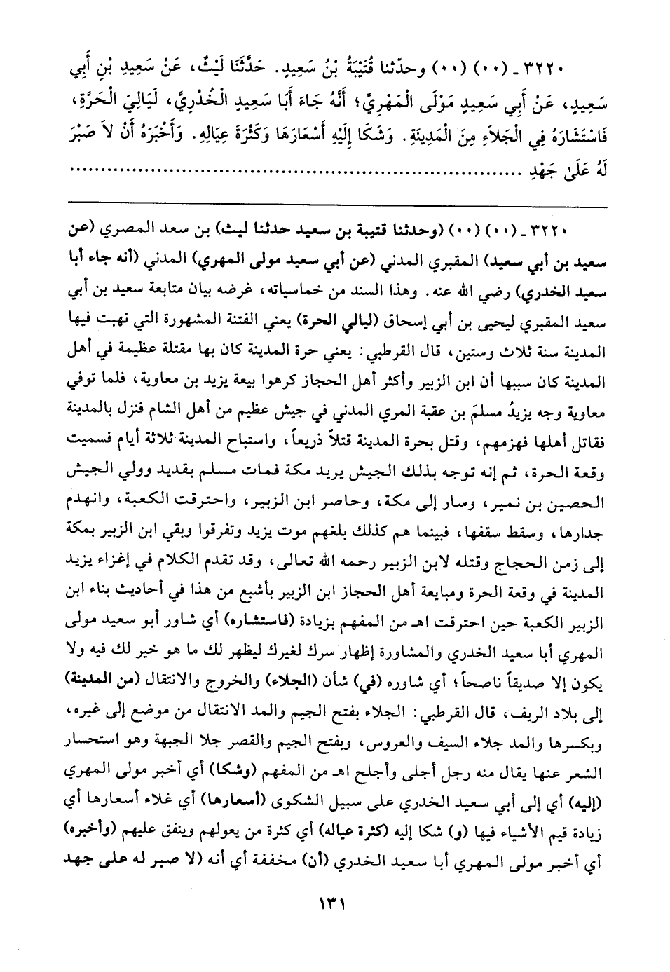 ٣٢٢٠ - (٠٠) (٠٠) وحدثنا قُتَيبَةُ بن سَعِيد. حَدَّثَنَا لَيث، عَن سَعِيدِ بنِ أبِي سَعِيد، عَن أبِي سَعِيد مَولَى المهرِي؛ أَنهُ جَاءَ أبَا سَعِيد الخدرِي، لَيَالِيَ الحرةِ، فَاستَشَارَهُ فِي الجلاءِ مِنَ المدِينَةِ. وَشَكَا إِلَيهِ أَشعَارَهَا وَكَثرَةَ عِيَالِهِ. وَأخبَرَهُ أَن لَا صَبرَ لَهُ عَلَى جَهدِ