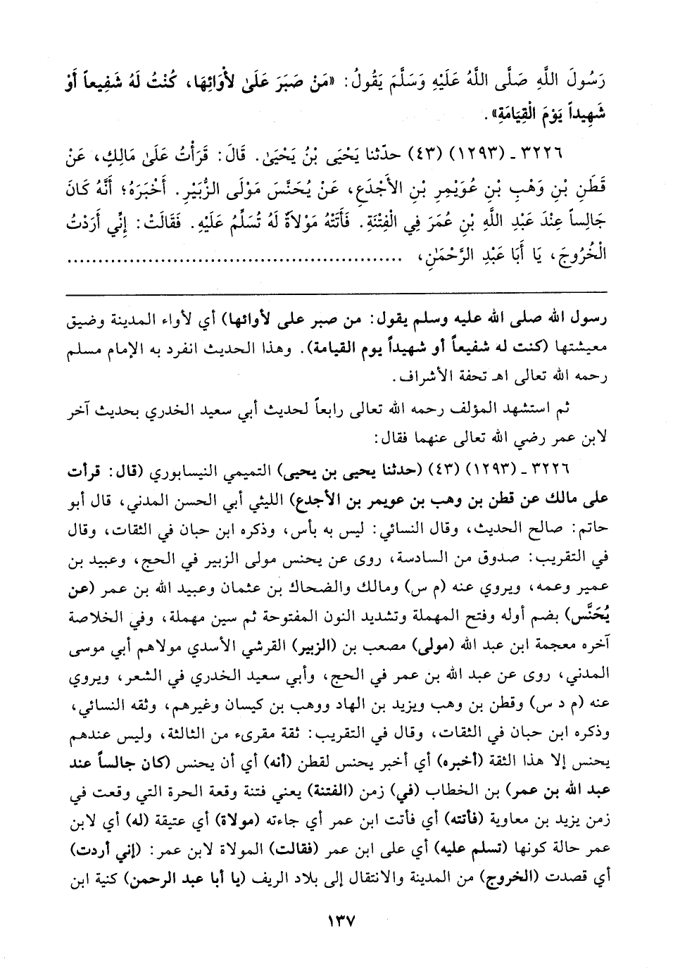 ٣٢٢٦ - (١٢٩٣) (٤٣) (حدثنا يحيى بن يحيى) التميمي النيسابوري (قال: قرأت على مالك عن قطن بن وهب بن عويمر بن الأجدع) الليثي أبي الحسن المدني، قال أبو حاتم: صالح الحديث، وقال النسائي: ليس به باس، وذكره ابن حبان في الثقات، وقال في التقريب: صدوق من السادسة، روى عن يحنس مولى الزبير في الحج، وعبيد بن عمير وعمه، ويروي عنه (م س) ومالك والضحاك بن عثمان وعبيد الله بن عمر (عن يُحَنَّس) بضم أوله وفتح المهملة وتشديد النون المفتوحة ثم سين مهملة، وفي الخلاصة آخره معجمة ابن عبد الله (مولى) مصعب بن (الزبير) القرشي الأسدي مولاهم أبي موسى المدني، روى عن عبد الله بن عمر في الحج، وأبي سعيد الخدري في الشعر، ويروي عنه (م د س) وقطن بن وهب ويزيد بن الهاد ووهب بن كيسان وغيرهم، وثقه النسائي، وذكره ابن حبان في الثقات، وقال في التقريب: ثقة مقرئ من الثالثة، وليس عندهم يحنس إلا هذا الثقة (أخبره) أي أخبر يحنس لقطن (أنه) أي أن يحنس (كان جالسًا عند عبد الله بن عمر) بن الخطاب (في) زمن (الفتنة) يعني فتنة وقعة الحرة التي وقعت في زمن يزيد بن معاوية (فأتته) أي فاتت ابن عمر أي جاءته (مولاة) أي عتيقة (له) أي لابن عمر حالة كونها (تسلم عليه) أي على ابن عمر (فقالت) المولاة لابن عمر: (إني أردت) أي قصدت (الخروج) من المدينة والانتقال إلى بلاد الريف (يا أبا عبد الرحمن) كنية ابن