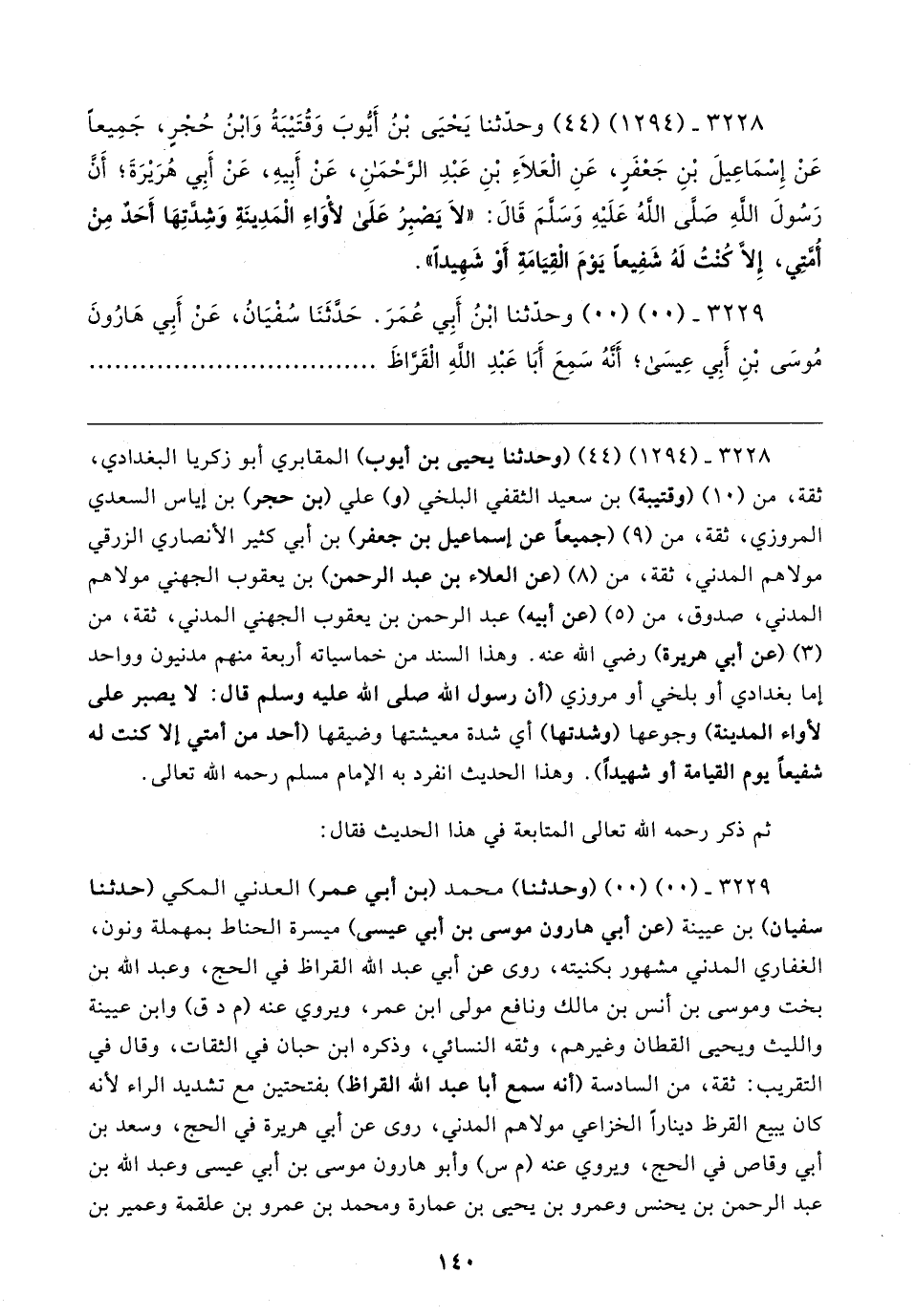 ٣٢٢٨ - (١٢٩٤) (٤٤) (وحدثنا يحيى بن أيوب) المقابري أبو زكريا البغدادي، ثقة، من (١٠) (وقتيبة) بن سعيد الثقفي البلخي (و) علي (بن حجر) بن إياس السعدي المروزي، ثقة، من (٩) (جميعًا عن إسماعيل بن جعفر) بن أبي كثير الأنصاري الزرقي مولاهم المدني، ثقة، من (٨) (عن العلاء بن عبد الرحمن) بن يعقوب الجهني مولاهم المدني، صدوق، من (٥) (عن أبيه) عبد الرحمن بن يعقوب الجهني المدني، ثقة، من (٣) (عن أبي هريرة) رضي الله عنه. وهذا السند من خماسياته أربعة منهم مدنيون وواحد إما بغدادي أو بلخي أو مروزي (أن رسول الله صلى الله عليه وسلم قال: لا يصبر على لأواء المدينة) وجوعها (وشدتها) أي شدة معيشتها وضيقها (أحد من أمتي إلا كنت له شفيعًا يوم القيامة أو شهيدًا). وهذا الحديث انفرد به الإمام مسلم رحمه الله تعالى.