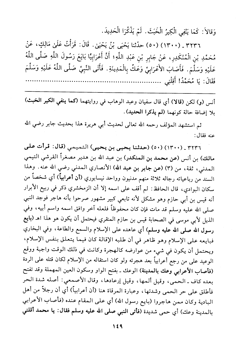 ٣٢٣٦ - (١٣٠٠) (٥٠) حدثنا يَحْيَى بْنُ يَحْيَى. قَال: قَرَأْتُ عَلَى مَالِكٍ، عَنْ مُحَمدِ بْنِ الْمُنْكَدِرِ، عَنْ جَابِرِ بْنِ عَبْدِ الله؛ أَن أَعْرَابِيًا بَايَعَ رَسُولَ اللهِ صلى اللهُ عَلَيهِ وَسَلَّمَ. فَأَصَابَ الأعرَابِي وَعَكٌ بِالْمَدِينَةِ. فَأَتَى النبِي صَلى الله عَلَيهِ وَسَلمَ فَقَال: يَا مُحَمدُ! أَقِلْنِي