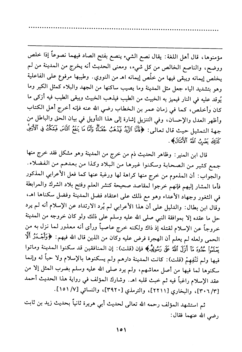 قال ابن المنير: وظاهر الحديث ذم من خرج من المدينة وهو مشكل فقد خرج منها جمع كثير من الصحابة وسكنوا غيرها من البلاد وكذا من بعدهم من الفضلاء. والجواب: أن المذموم من خرج منها كراهة لها ورغبة عنها كما فعل الأعرابي المذكور فأما المشار إليهم فإنهم خرجوا لمقاصد صحيحة كنشر العلم وفتح بلاد الشرك والمرابطة في الثغور وجهاد الأعداء وهو مع ذلك على اعتقاد فضل المدينة وفضل سكناها اهـ، وقال ابن بطال: والدليل على أن هذا الأعرابي لم يُرد الارتداد عن الإسلام أنه لم يرد حل ما عقده إلا بموافقة النبي صلى الله عليه وسلم على ذلك ولو كان خروجه من المدينة خروجًا عن الإسلام لقتله إذ ذاك ولكنه خرج عاصيًا ورأى أنه معذور لما نزل به من الحمى ولعله لم يعلم أن الهجرة فرض عليه وكان من الذين قال الله فيهم: {وَأَجْدَرُ أَلَّا يَعْلَمُوا حُدُودَ مَا أَنْزَلَ اللَّهُ عَلَى رَسُولِهِ وَاللَّهُ عَلِيمٌ حَكِيمٌ} فإن (قلت): إن المنافقين قد سكنوا المدينة وماتوا فيها ولم تَنْفِهِمْ (قلت): كانت المدينة دارهم ولم يسكنوها بالإسلام ولا حبًّا له وإنما سكنوها لما فيها من أصل معاشهم، ولم يرد صلى الله عليه وسلم بضرب المثل إلا من عقد الإسلام راغبًا فيه ثم خبث قلبه اهـ. وشارك المؤلف في رواية هذا الحديث أحمد [٣/ ٣٥٦]، والبخاري [٢٢١١]، والترمذي [٣٩٢٠]، والنسائي [٧/ ١٥١].