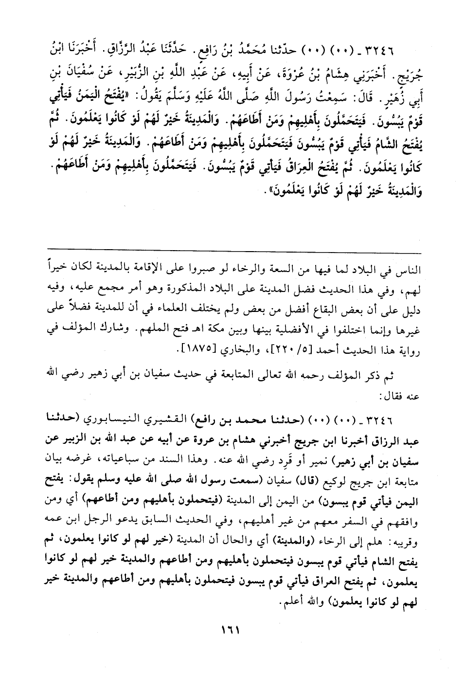 ٣٢٤٦ (٠٠) (٠٠) حدثنا مُحَمدُ بْنُ رَافِع. حَدَّثَنَا عَبْدُ الرزاق. أَخْبَرَنَا ابْنُ جُرَيج. أَخْبَرَنِي هِشَامُ بْنُ عُروَهٌ، عَنْ أَبيهِ، عَنْ عَبْدِ الله بْنِ الزبَيرِ، عَنْ سُفْيَانَ بْنِ أَبِي زُهَيرِ. قَال: سَمِعْتُ رَسُولَ الله صَلى الله عَلَيهِ وَسَلمَ يَقُولُ: "يُفْتَحُ الْيَمَنُ فَيَأتِي قَوْمْ يَبُسُّونَ. فَيَتَحَملُونَ بِأهْلِيهِمْ وَمَنْ أَطَاعَهُمْ. وَالْمَدِينَةُ خَير لَهُمْ لَوْ كَانُوا يَعْلَمُونَ. ثم يُفْتَحُ الشامُ فَيَأتِي قَوْه يَبُسُّونَ فَيَتَحَمَلُونَ بِأهْلِيهِمْ وَمَنْ أَطَاعَهُمْ. وَالْمَدِينَةُ خَيرْ لَهُمْ لَوْ كَانُوا يَعْلَمُونَ. ثم يُفْتَحُ الْعِرَاقُ فَيَأتِي قَوْم يَبُسونَ. فَيَتَحَملُونَ بِأهْلِيهِمْ وَمَنْ أَطَاعَهُمْ. وَالْمَدِينَةُ خَير لَهُمْ لَوْ كَانُوا يَعْلَمُونَ"