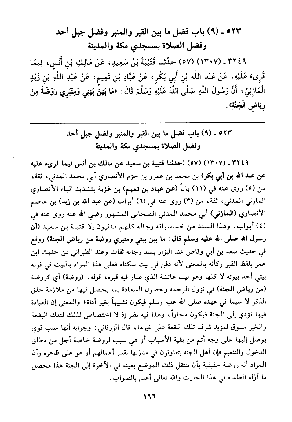 ٥٢٣ - (٩) باب فضل ما بين القبر والمنبر وفضل جبل أحد وفضل الصلاة بمسجدي مكة والمدينة