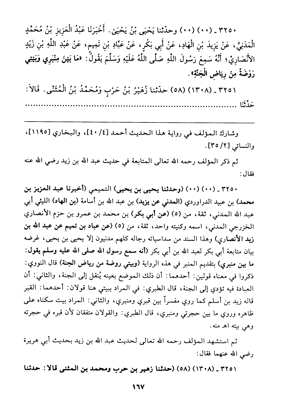 ٣٢٥٠ - (٠٠) (٠٠) وحدثنا يَحيَى بن يَحيى. أَخبَرَنَا عَبدُ العَزِيزِ بن مُحَمَّد المدَنيُّ، عَن يَزِيدَ بْنِ الهَادِ، عَن أَبِي بَكرِ، عَن عَبَّادِ بنِ تَمِيم، عَن عَبْدِ الله بنِ زَيدٍ الأَنْصَارِي؛ أَنهُ سَمِعَ رَسُولَ الله صلى الله عَلَيهِ وَسَلَّمَ يَقُولُ: "مَا بَينَ مِنْبَرِي وَبَيتِي رَوْضَةٌ مِنْ رِيَاضِ الجنةِ".