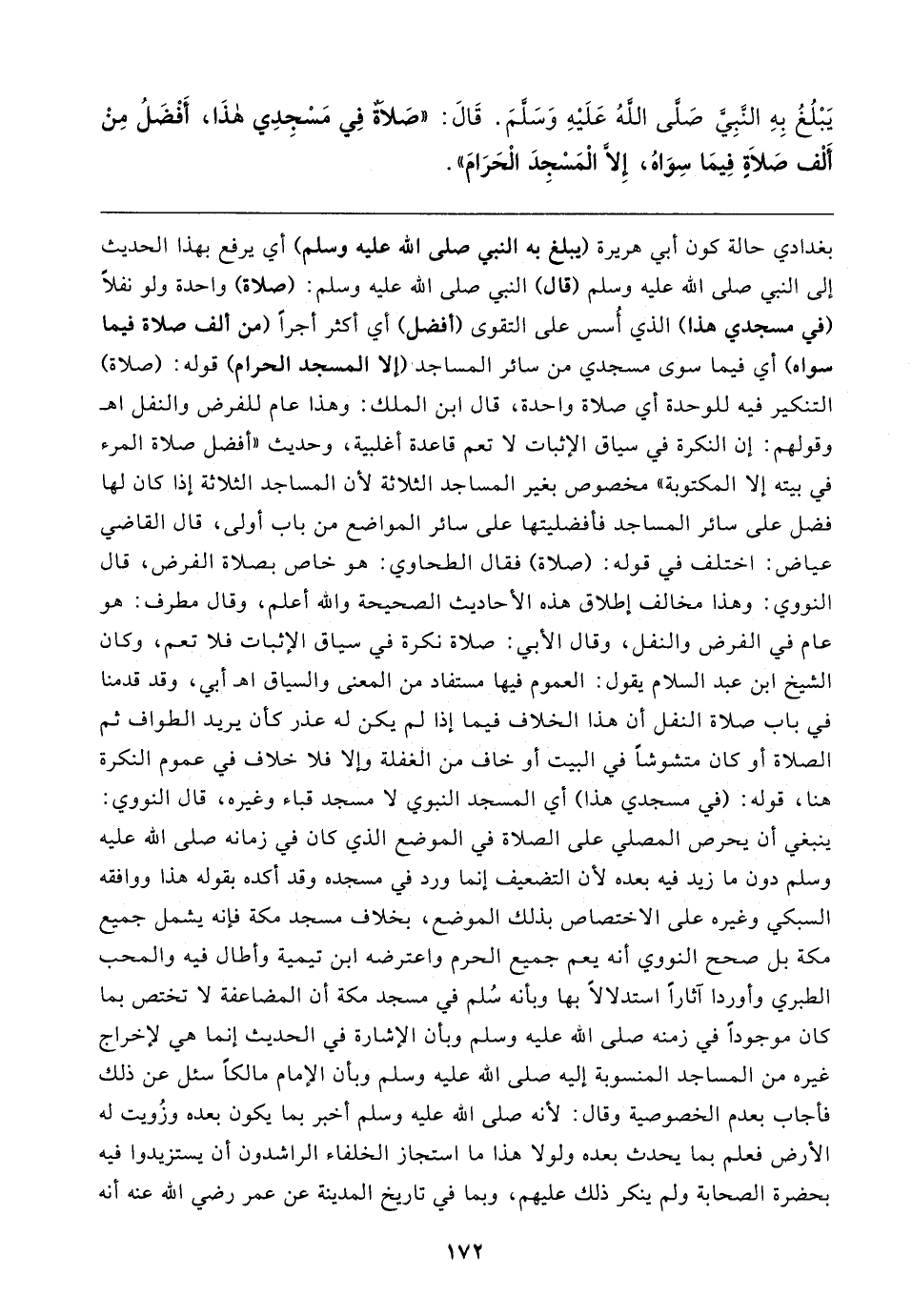 بغدادي حالة كون أبي هريرة (يبلغ به النبي صلى الله عليه وسلم) أي يرفع بهذا الحديث إلى النبي صلى الله عليه وسلم (قال) النبي صلى الله عليه وسلم: (صلاة) واحدة ولو نفلًا (في مسجدي هذا) الذي أُسس على التقوى (أفضل) أي أكثر أجرًا (من ألف صلاة فيما سواه) أي فيما سوى مسجدي من سائر المساجد (إلا المسجد الحرام) قوله: (صلاة) التنكير فيه للوحدة أي صلاة واحدة، قال ابن الملك: وهذا عام للفرض والنفل اهـ وقولهم: إن النكرة في سياق الإثبات لا تعم قاعدة أغلبية، وحديث "أفضل صلاة المرء في بيته إلا المكتوبة" مخصوص بغير المساجد الثلاثة لأن المساجد الثلاثة إذا كان لها فضل على سائر المساجد فأفضليتها على سائر المواضع من باب أولى، قال القاضي عياض: اختلف في قوله: (صلاة) فقال الطحاوي: هو خاص بصلاة الفرض، قال النووي: وهذا مخالف إطلاق هذه الأحاديث الصحيحة والله أعلم، وقال مطرف: هو عام في الفرض والنفل، وقال الأبي: صلاة نكرة في سياق الإثبات فلا تعم، وكان الشيخ ابن عبد السلام يقول: العموم فيها مستفاد من المعنى والسياق اهـ أبي، وقد قدمنا في باب صلاة الشكل أن هذا الخلاف فيما إذا لم يكن له عذر كان يريد الطواف ثم الصلاة أو كان متشوشًا في البيت أو خاف من الغفلة وإلا فلا خلاف في عموم النكرة هنا، قوله: (في مسجدي هذا) أي المسجد النبوي لا مسجد قباء وغيره، قال النووي: ينبغي أن يحرص المصلي على الصلاة في الموضع الذي كان في زمانه صلى الله عليه وسلم دون ما زيد فيه بعده لأن التضعيف إنما ورد في مسجده وقد أكده بقوله هذا ووافقه السبكي وغيره على الاختصاص بذلك الموضع، بخلاف مسجد مكة فإنه يشمل جميع مكة بل صحح النووي أنه يعم جميع الحرم واعترضه ابن تيمية وأطال فيه والمحب الطبري وأوردا آثارًا استدلالًا بها وبأنه سُلم في مسجد مكة أن المضاعفة لا تختص بما كان موجودًا في زمنه صلى الله عليه وسلم وبأن الإشارة في الحديث إنما هي لإخراج غيره من المساجد المنسوبة إليه صلى الله عليه وسلم وبأن الإمام مالكًا سئل عن ذلك فأجاب بعدم الخصوصية وقال: لأنه صلى الله عليه وسلم أخبر بما يكون بعده وزُويت له الأرض فعلم بما يحدث بعده ولولا هذا ما استجاز الخلفاء الراشدون أن يستزيدوا فيه بحضرة الصحابة ولم ينكر ذلك عليهم، وبما في تاريخ المدينة عن عمر رضي الله عنه أنه