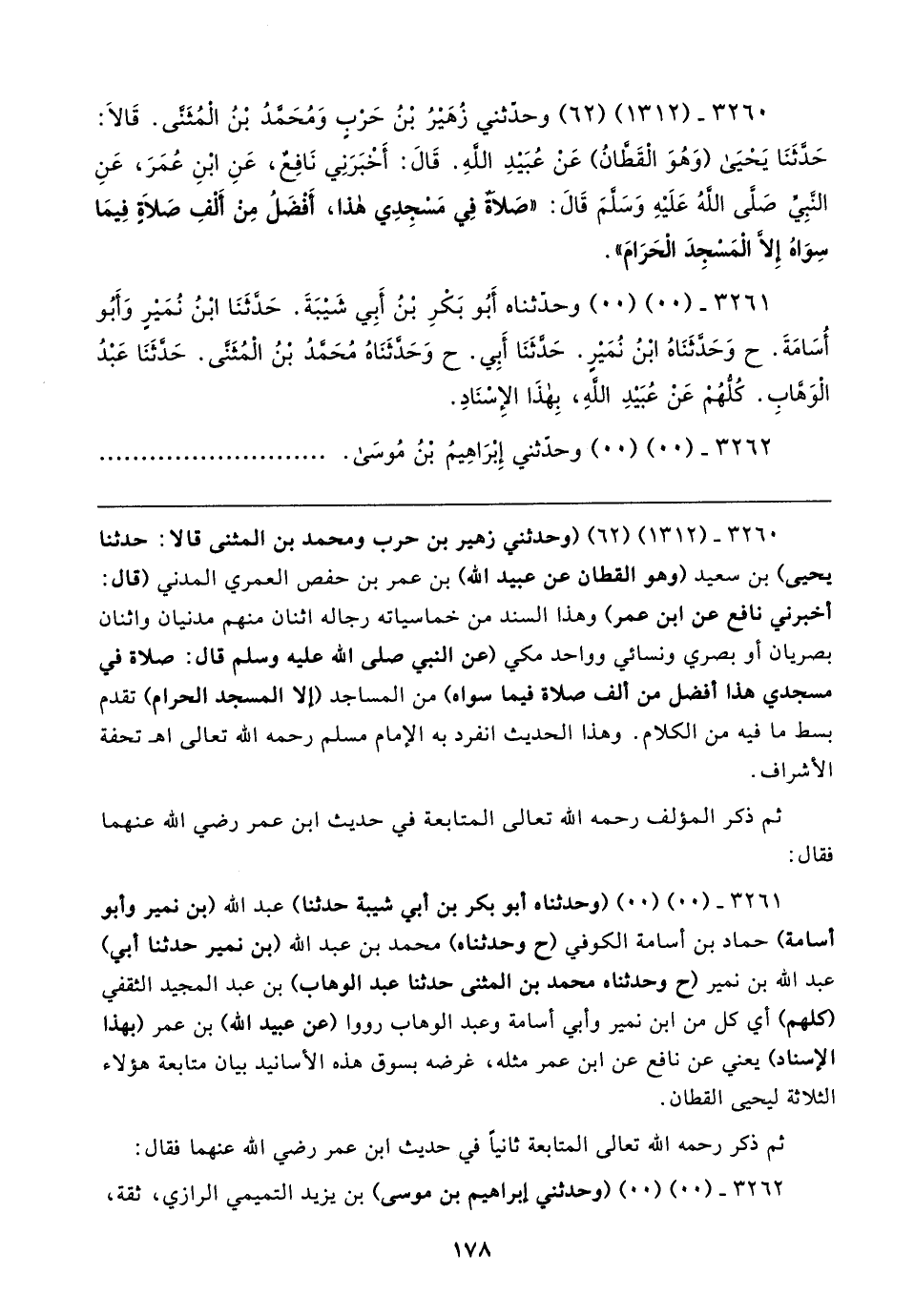 ٣٢٦٠ - (١٣١٢) (٦٢) وحدّثني زُهَيرُ بْنُ حَرْبٍ وَمُحَمَّدُ بْنُ الْمُثنَّى. قَالا: حَدَّثَنَا يَحْيَى (وَهُوَ الْقَطَّانُ) عَنْ عُبَيدِ اللهِ. قَال: أَخْبَرَنِي نَافِعٌ، عَنِ ابْنِ عُمَرَ، عَنِ النَّبِيِّ صَلَّى اللهُ عَلَيهِ وَسَلَّمَ قَال: "صَلاةٌ فِي مَسْجِدِي هذا، أَفْضَلُ مِنْ أَلْفِ صَلاةٍ فِيمَا سِوَاهُ إِلَّا الْمَسْجِدَ الْحَرَامَ".