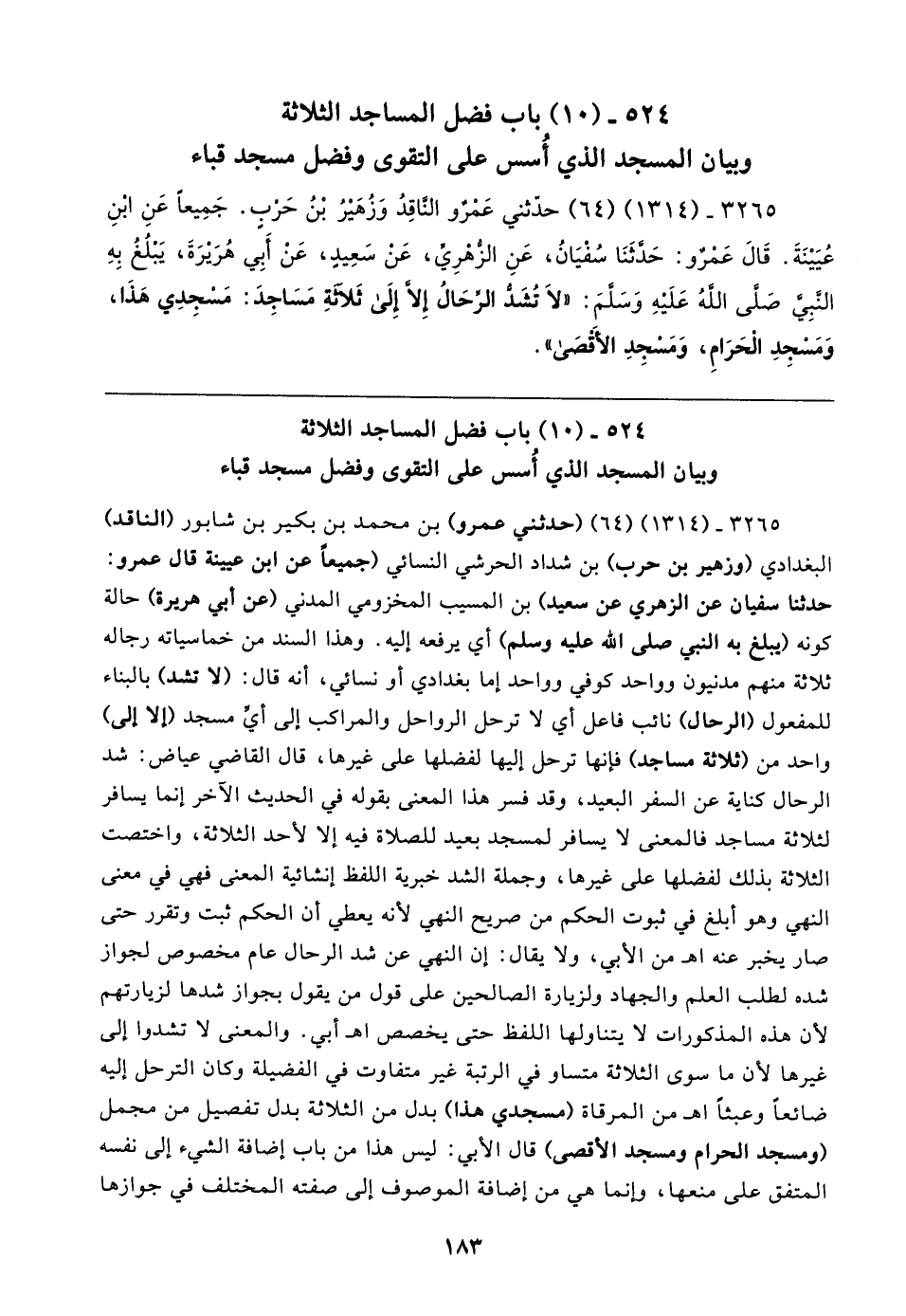٣٢٦٥ - (١٣١٤) (٦٤) حدّثني عَمْرو النَّاقِدُ وَزُهَيرُ بْنُ حَرْب. جَمِيعًا عَنِ ابْنِ عُيَينَةَ. قَال عَمْرٌو: حَدَّثَنَا سُفْيَانُ، عَنِ الزُّهْرِيِّ، عَنْ سَعِيدٍ، عَنْ أَبِي هُرَيرَةَ، يَبْلُغُ بِهِ النَّبِيَّ صَلَّى اللهُ عَلَيهِ وَسَلَّمَ: "لَا تُشَدُّ الرِّحَالُ إِلَّا إِلَى ثَلاثةِ مَسَاجِدَ: مَسْجِدِي هَذَا، وَمَسْجِدِ الْحَرَامِ، وَمَسْجِدِ الأَقْصَى"