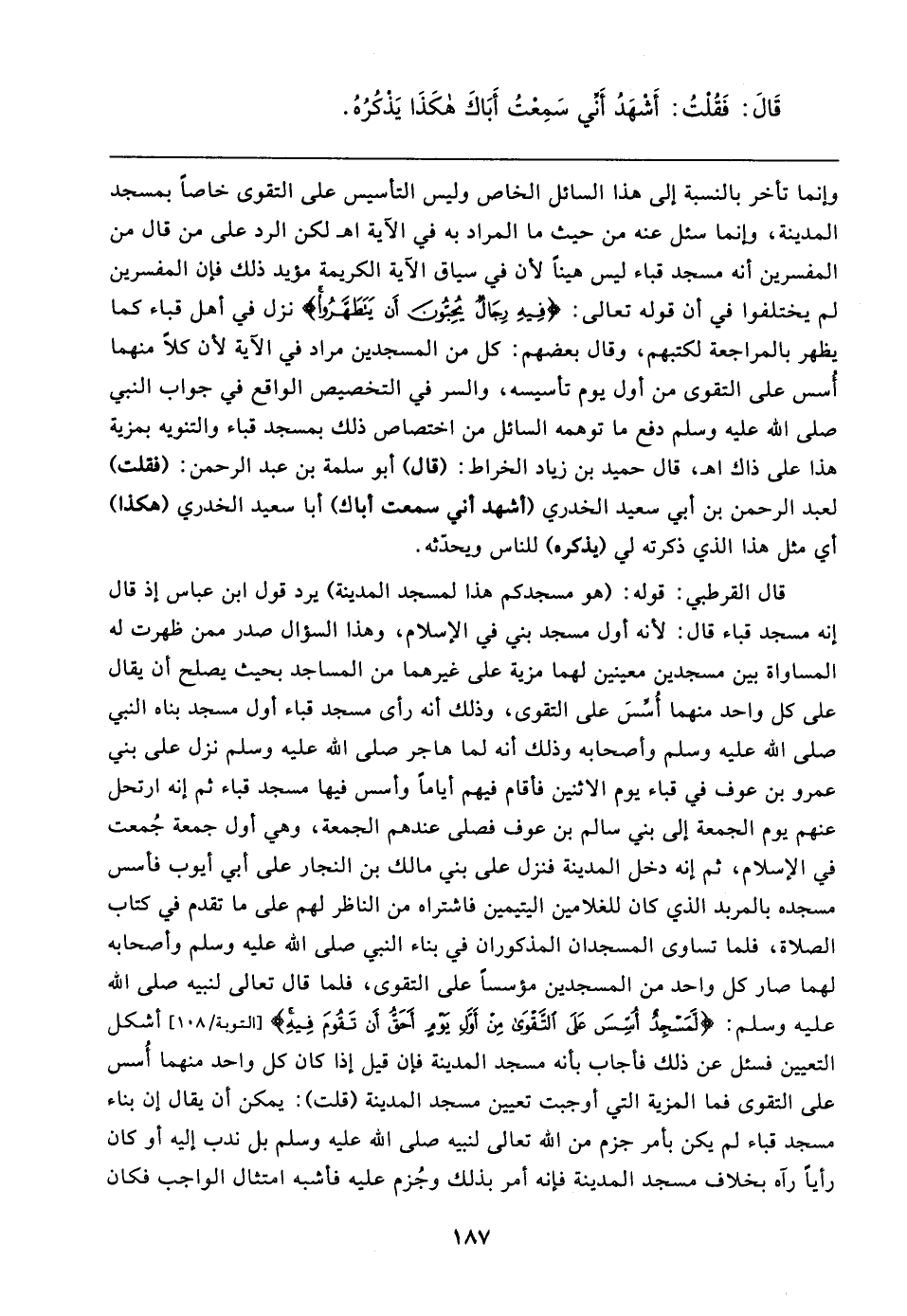وإنما تأخر بالنسبة إلى هذا السائل الخاص وليس التأسيس على التقوى خاصًّا بمسجد المدينة، وإنما سئل عنه من حيث ما المراد به في الآية اهـ لكن الرد على من قال من المفسرين أنه مسجد قباء ليس هينًا لأن في سياق الآية الكريمة مؤيد ذلك فإن المفسرين لم يختلفوا في أن قوله تعالى: {فِيهِ رِجَالٌ يُحِبُّونَ أَنْ يَتَطَهَّرُوا} نزل في أهل قباء كما يظهر بالمراجعة لكتبهم، وقال بعضهم: كل من المسجدين مراد في الآية لأن كلًّا منهما أسس على التقوى من أول يوم تأسيسه، والسر في التخصيص الواقع في جواب النبي صلى الله عليه وسلم دفع ما توهمه السائل من اختصاص ذلك بمسجد قباء والتويه بمزية هذا على ذاك اهـ، قال حميد بن زياد الخراط: (قال) أبو سلمة بن عبد الرحمن: (فقلت) لعبد الرحمن بن أبي سعيد الخدري (أشهد أني سمعت أباك) أبا سعيد الخدري (هكذا) أي مثل هذا الذي ذكرته لي (يذكره) للناس ويحدّثه.