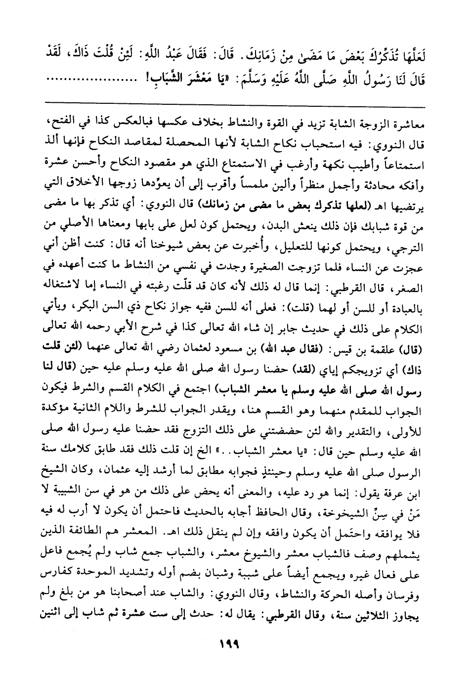 لَعَلَّهَا تُذَكِّرُكَ بَعْضَ مَا مَضَى مِنْ زَمَانِكَ. قَال: فَقَال عَبْدُ اللهِ: لَئِنْ قُلْتَ ذَاكَ، لَقَدْ قَال لَنَا رَسُولُ اللهِ - صلى الله عليه وسلم -: "يَا مَعْشَرَ الشبَابِ!