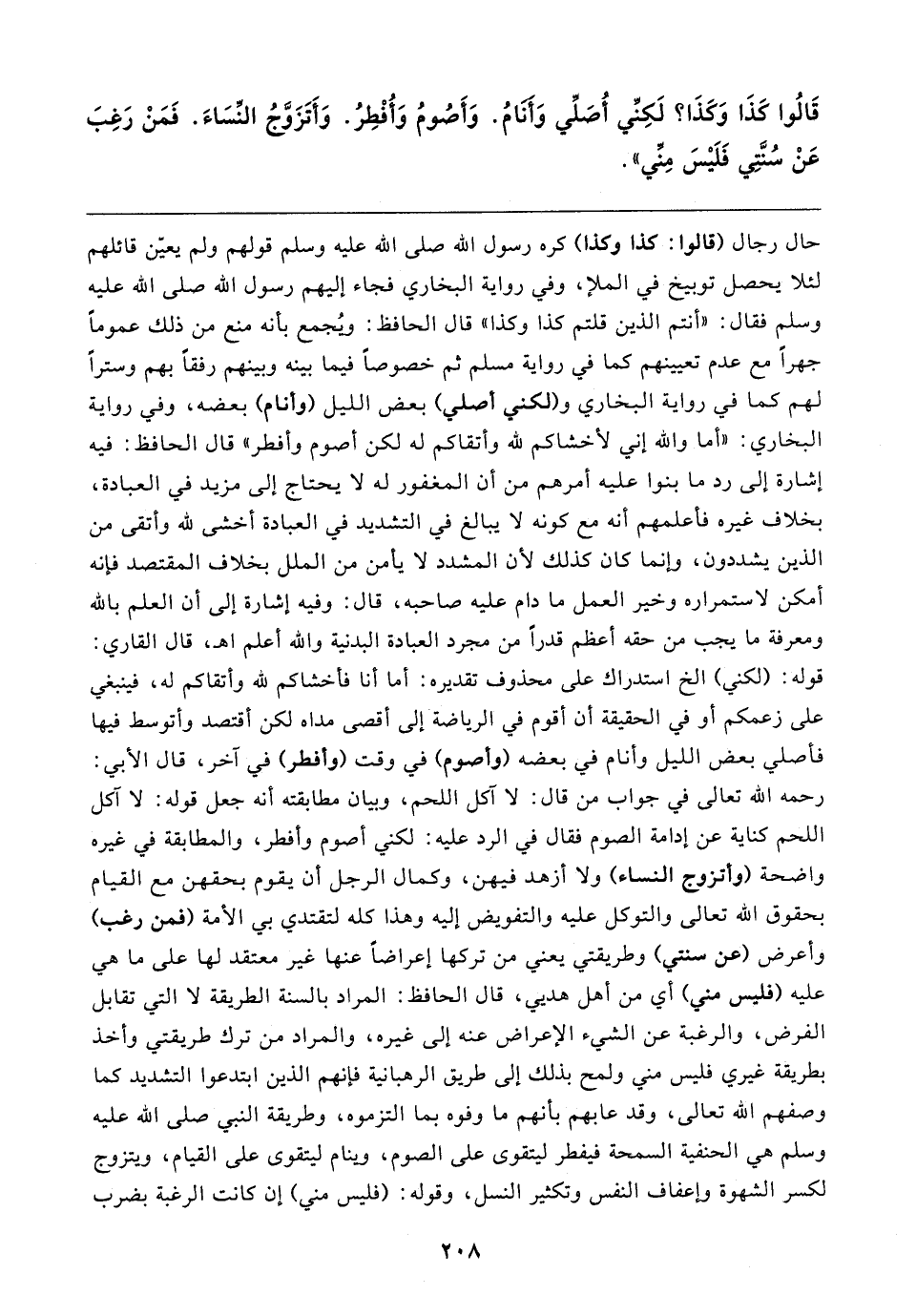 حال رجال (قالوا: كذا وكذا) كره رسول الله صلى الله عليه وسلم قولهم ولم يعيّن قائلهم لئلا يحصل توبيخ في الملإ، وفي رواية البخاري فجاء إليهم رسول الله صلى الله عليه وسلم فقال: "أنتم الذين قلتم كذا وكذا" قال الحافظ: ويُجمع بأنه منع من ذلك عمومًا جهرًا مع عدم تعيينهم كما في رواية مسلم ثم خصوصًا فيما بينه وبينهم رفقًا بهم وسترًا لهم كما في رواية البخاري و (لكني أصلي) بعض الليل (وأنام) بعضه، وفي رواية البخاري: "أما والله إني لأخشاكم لله وأتقاكم له لكن أصوم وأفطر" قال الحافظ: فيه إشارة إلى رد ما بنوا عليه أمرهم من أن المغفور له لا يحتاج إلى مزيد في العبادة، بخلاف غيره فأعلمهم أنه مع كونه لا يبالغ في التشديد في العبادة أخشى لله وأتقى من الذين يشددون، وإنما كان كذلك لأن المشدد لا يأمن من الملل بخلاف المقتصد فإنه أمكن لاستمراره وخير العمل ما دام عليه صاحبه، قال: وفيه إشارة إلى أن العلم بالله ومعرفة ما يجب من حقه أعظم قدرًا من مجرد العبادة البدنية والله أعلم اهـ، قال القاري: قوله: (لكني) الخ استدراك على محذوف تقديره: أما أنا فاخشاكم لله وأتقاكم له، فينبغي على زعمكم أو في الحقيقة أن أقوم في الرياضة إلى أقصى مداه لكن أقتصد وأتوسط فيها فأصلي بعض الليل وأنام في بعضه (وأصوم) في وقت (وأفطر) في آخر، قال الأبي: رحمه الله تعالى في جواب من قال: لا آكل اللحم، وبيان مطابقته أنه جعل قوله: لا آكل اللحم كناية عن إدامة الصوم فقال في الرد عليه: لكني أصوم وأفطر، والمطابقة في غيره واضحة (وأتزوج النساء) ولا أزهد فيهن، وكمال الرجل أن يقوم بحقهن مع القيام بحقوق الله تعالى والتوكل عليه والتفويض إليه وهذا كله لتقتدي بي الأمة (فمن رغب) وأعرض (عن سنتي) وطريقتي يعني من تركها إعراضًا عنها غير معتقد لها على ما هي عليه (فليس مني) أي من أهل هديي، قال الحافظ: المراد بالسنة الطريقة لا التي تقابل الفرض، والرغبة عن الشيء الإعراض عنه إلى غيره، والمراد من ترك طريقتي وأخذ بطريقة غيري فليس مني ولمح بذلك إلى طريق الرهبانية فإنهم الذين ابتدعوا التشديد كما وصفهم الله تعالى، وقد عابهم بأنهم ما وفوه بما التزموه، وطريقة النبي صلى الله عليه وسلم هي الحنفية السمحة فيفطر ليتقوى على الصوم، وينام ليتقوى على القيام، ويتزوج لكسر الشهوة وإعفاف النفس وتكثير النسل، وقوله: (فليس مني) إن كانت الرغبة بضرب