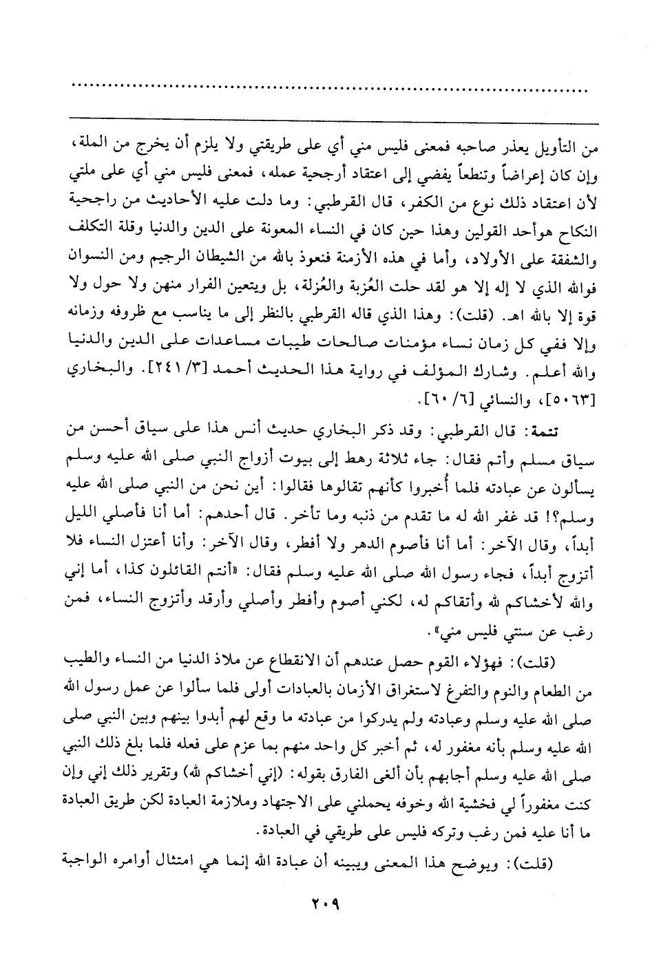 من التأويل يعذر صاحبه فمعنى فليس مني أي على طريقتي ولا يلزم أن يخرج من الملة، وإن كان إعراضًا وتنطعًا يفضي إلى اعتقاد أرجحية عمله، فمعنى فليس مني أي على ملتي لأن اعتقاد ذلك نوع من الكفر، قال القرطبي: وما دلت عليه الأحاديث من راجحية النكاح هو أحد القولين وهذا حين كان في النساء المعونة على الدين والدنيا وقلة التكلف والشفقة على الأولاد، وأما في هذه الأزمنة فنعوذ بالله من الشيطان الرجيم ومن النسوان فوالله الذي لا إله إلا هو لقد حلت العُزبة والغزلة، بل ويتعين الفرار منهن ولا حول ولا قوة إلا بالله اهـ. (قلت): وهذا الذي قاله القرطبي بالنظر إلى ما يناسب مع ظروفه وزمانه وإلا ففي كل زمان نساء مؤمنات صالحات طيبات مساعدات على الدين والدنيا والله أعلم. وشارك المؤلف في رواية هذا الحديث أحمد [٣/ ٢٤١]. والبخاري [٥٠٦٣]، والنسائي [٦٠/ ٦].