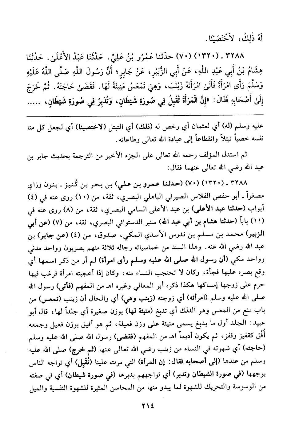 ٣٢٨٨ - (١٣٢٠) (٧٠) (حدثنا عمرو بن علي) بن بحر بن كُنيز -بنون وزاي مصغرًا- أبو حفص الفلاس الصيرفي الباهلي البصري، ثقة، من (١٠) روى عنه في (٤) أبواب (حدثنا عبد الأعلى) بن عبد الأعلى السامي البصري، ثقة، من (٨) روى عنه في (١١) بابا (حدثنا هشام بن أبي عبد الله) سنبر الدستوائي البصري، ثقة، من (٧) (عن أبي الزبير) محمد بن مسلم بن تدرس الأسدي المكي، صدوق، من (٤) (عن جابر) بن عبد الله رضي الله عنه. وهذا السند من خماسياته رجاله ثلاثة منهم بصريون وواحد مدني وواحد مكي (أن رسول الله صلى الله عليه وسلم رأى امرأة) لم أر من ذكر اسمها أي وقع بصره عليها فجاة، وكان لا تحتجب النساء منه، وكان إذا أعجبته امرأة فرغب فيها حرم على زوجها إمساكها هكذا ذكره أبو المعالي وغيره اهـ من المفهم (فأتى) رسول الله صلى الله عليه وسلم (امرأته) أي زوجته (زينب وهي) أي والحال أن زينب (تمعس) من باب منع من المعس وهو الدلك أي تدبغ (منيئة لها) بوزن صغيرة أي جلدًا لها، قال أبو عبيد: الجلد أول ما يدبغ يسمى منيئة على وزن فعيلة، ثم هو أفيق بوزن فعيل وجمعه أُفُق كقفيز وقفز، ثم يكون أديمًا اهـ من المفهم (فقضى) رسول الله صلى الله عليه وسلم (حاجته) أي شهوته في النساء من زينب رضي الله تعالى عنها (ثم خرج) صلى الله عليه وسلم من عندها (إلي أصحابه فقال: أن المرأة) التي مرت علينا (تُقْبِل) أي تواجه الناس بوجهها (في صورة الشيطان وتدبر) أي تواجههم بدبرها (في صورة شيطان) أي في صفته من الوسوسة والتحريك للشهوة لما يبدو منها من المحاسن المثيرة للشهوة النفسية والميل