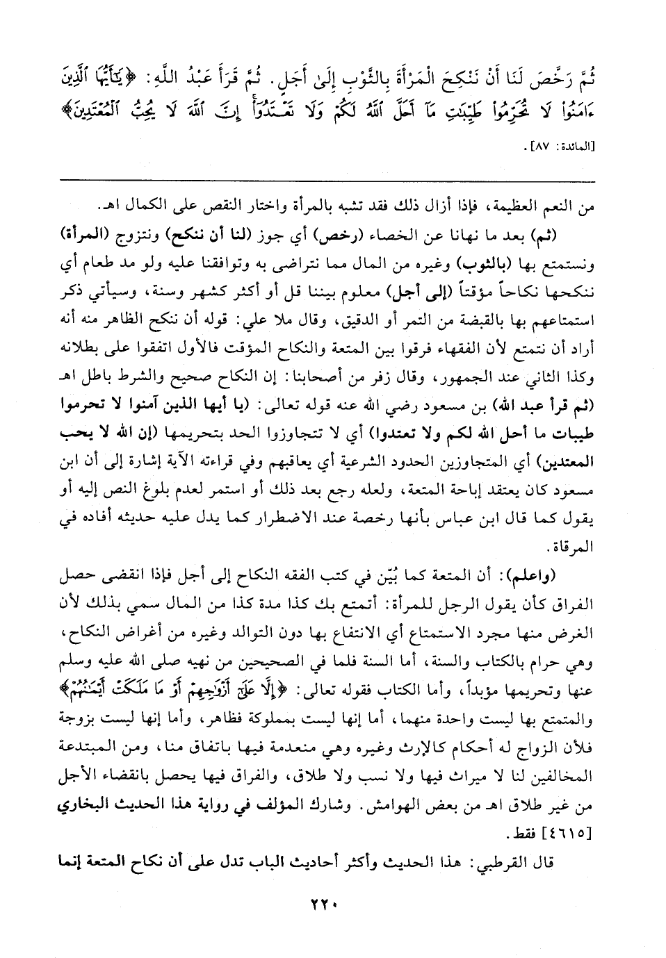 ثُم رَخَّصَ لَنَا أَنْ نَنْكِحَ الْمَرْأَةَ بِالثَّوْبِ إِلَى أَجَلٍ. ثمَّ قَرَأَ عَبْدُ اللهِ: {يَا أَيُّهَا الَّذِينَ آمَنُوا لَا تُحَرِّمُوا طَيِّبَاتِ مَا أَحَلَّ اللَّهُ لَكُمْ وَلَا تَعْتَدُوا إِنَّ اللَّهَ لَا يُحِبُّ الْمُعْتَدِينَ} [المائدة: ٨٧]