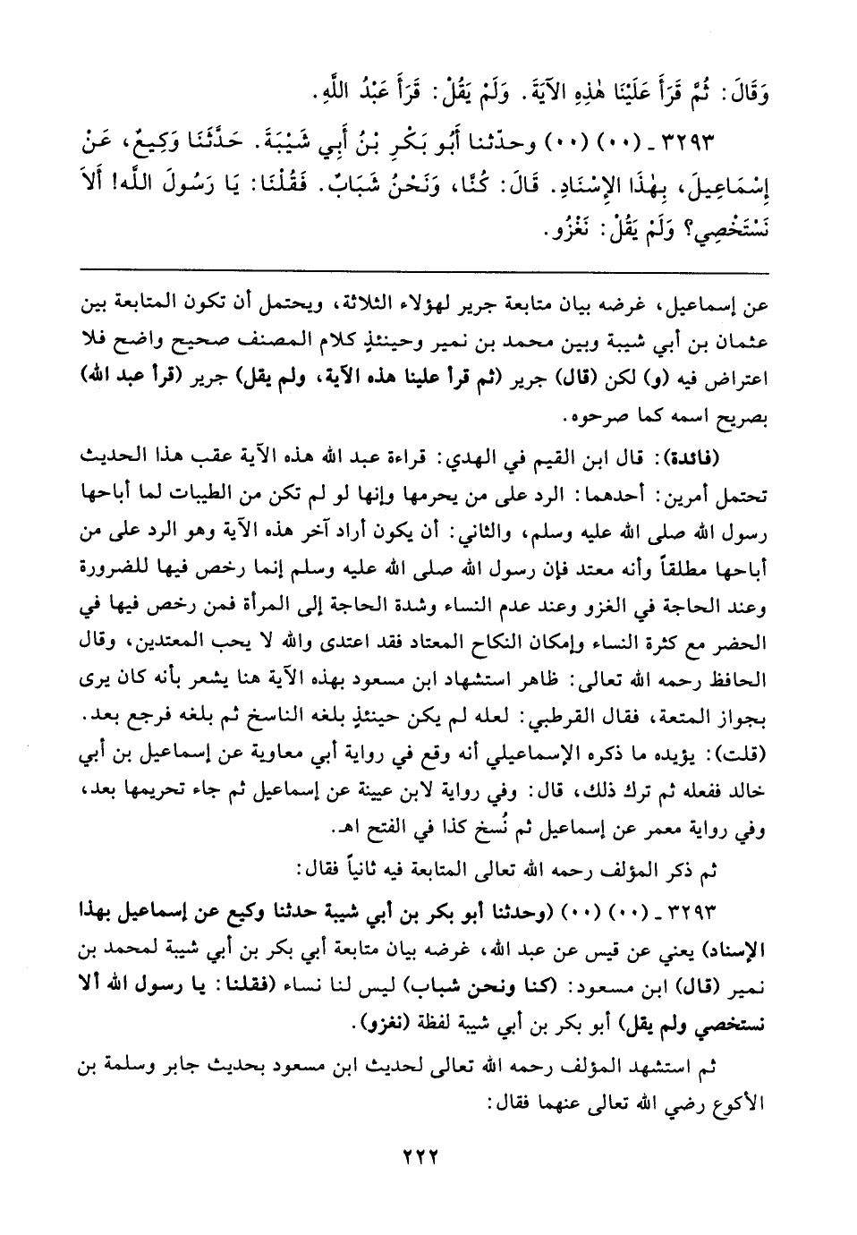 (فائدة): قال ابن القيم في الهدي: قراءة عبد الله هذه الآية عقب هذا الحديث تحتمل أمرين: أحدهما: الرد على من يحرمها وإنها لو لم تكن من الطيبات لما أباحها رسول الله صلى الله عليه وسلم، والثاني: أن يكون أراد آخر هذه الآية وهو الرد على من أباحها مطلقًا وأنه معتد فإن رسول الله صلى الله عليه وسلم إنما رخص فيها للضرورة وعند الحاجة في الغزو وعند عدم النساء وشدة الحاجة إلى المرأة فمن رخص فيها في الحضر مع كثرة النساء وإمكان النكاح المعتاد فقد اعتدى والله لا يحب المعتدين، وقال الحافظ رحمه الله تعالى: ظاهر استشهاد ابن مسعود بهذه الآية هنا يشعر بأنه كان يرى بجواز المتعة، فقال القرطبي: لعله لم يكن حينئذٍ بلغه الناسخ ثم بلغه فرجع بعد. (قلت): يؤيده ما ذكره الإسماعيلي أنه وقع في رواية أبي معاوية عن إسماعيل بن أبي خالد ففعله ثم ترك ذلك، قال: وفي رواية لابن عيينة عن إسماعيل ثم جاء تحريمها بعد، وفي رواية معمر عن إسماعيل ثم نُسخ كذا في الفتح اهـ.