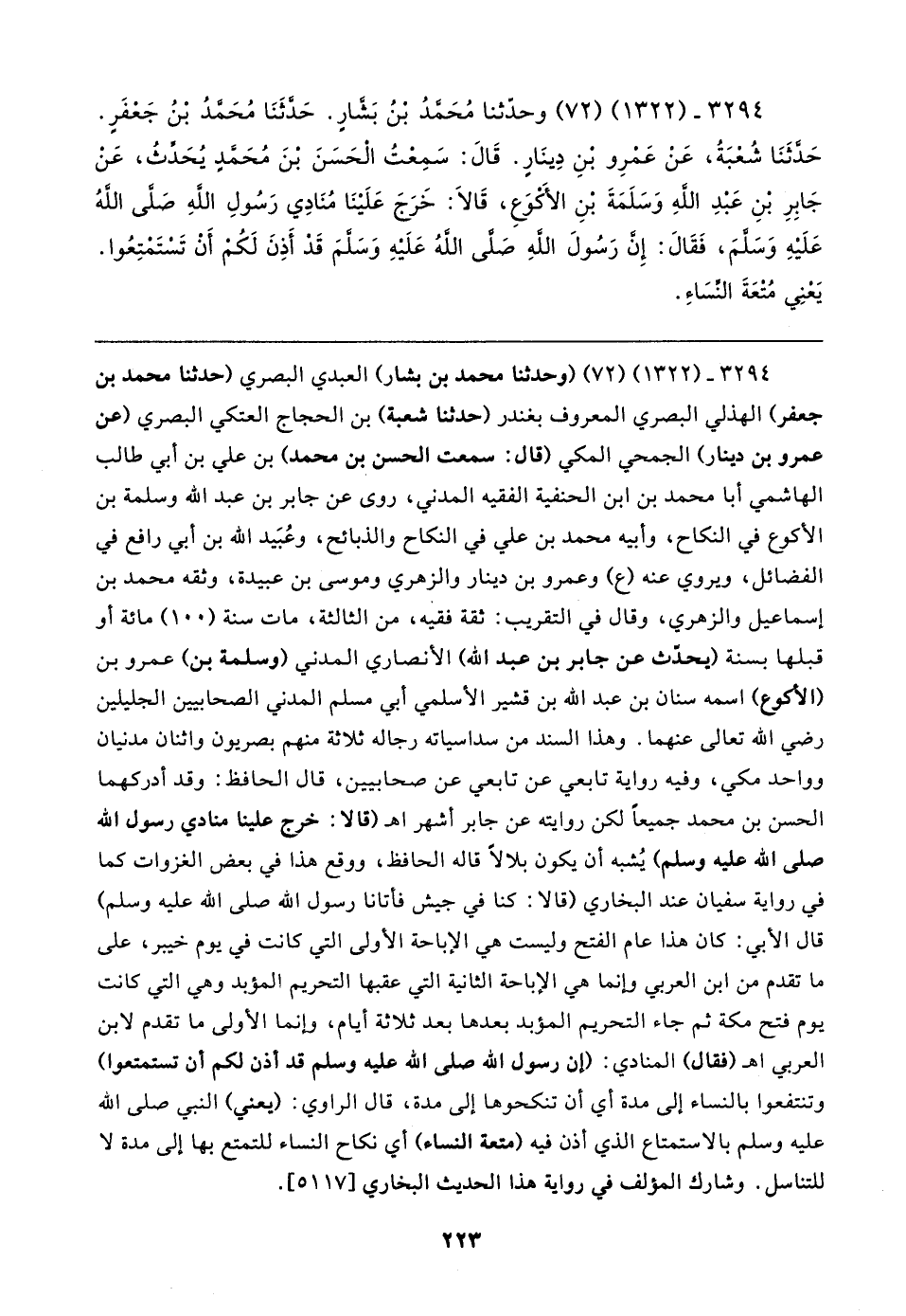 ٣٢٩٤ - (١٣٢٢) (٧٢) (وحدثنا محمد بن بشار) العبدي البصري (حدثنا محمد بن جعفر) الهذلي البصري المعروف بغندر (حدثنا شعبة) بن الحجاج العتكي البصري (عن عمرو بن دينار) الجمحي المكي (قال: سمعت الحسن بن محمد) بن علي بن أبي طالب الهاشمي أبا محمد بن ابن الحنفية الفقيه المدني، روى عن جابر بن عبد الله وسلمة بن الأكوع في النكاح، وأبيه محمد بن علي في النكاح والذبائح، وعُبَيد الله بن أبي رافع في الفضائل، ويروي عنه (ع) وعمرو بن دينار والزهري وموسى بن عبيدة، وثقه محمد بن إسماعيل والزهري، وقال في التقريب: ثقة فقيه، من الثالثة، مات سنة (١٠٠) مائة أو قبلها بسنة (يحدّث عن جابر بن عبد الله) الأنصاري المدني (وسلمة بن) عمرو بن (الأكوع) اسمه سنان بن عبد الله بن قشير الأسلمي أبي مسلم المدني الصحابيين الجليلين رضي الله تعالى عنهما. وهذا السند من سداسياته رجاله ثلاثة منهم بصريون واثنان مدنيان وواحد مكي، وفيه رواية تابعي عن تابعي عن صحابيين، قال الحافظ: وقد أدركهما الحسن بن محمد جميعًا لكن روايته عن جابر أشهر اهـ (قالا: خرج علينا منادي رسول الله صلى الله عليه وسلم) يُشبه أن يكون بلالًا قاله الحافظ، ووقع هذا في بعض الغزوات كما في رواية سفيان عند البخاري (قالا: كنا في جيش فأتانا رسول الله صلى الله عليه وسلم) قال الأبي: كان هذا عام الفتح وليست هي الإباحة الأولى التي كانت في يوم خيبر، على ما تقدم من ابن العربي وإنما هي الإباحة الثانية التي عقبها التحريم المؤبد وهي التي كانت يوم فتح مكة ثم جاء التحريم المؤبد بعدها بعد ثلاثة أيام، وإنما الأولى ما تقدم لابن العربي اهـ (فقال) المنادي: (إن رسول الله صلى الله عليه وسلم قد أذن لكم أن تستمتعوا) وتنتفعوا بالنساء إلى مدة أي أن تنكحوها إلى مدة، قال الراوي: (يعني) النبي صلى الله عليه وسلم بالاستمتاع الذي أذن فيه (متعة النساء) أي نكاح النساء للتمتع بها إلى مدة لا للتناسل. وشارك المؤلف في رواية هذا الحديث البخاري [٥١١٧].