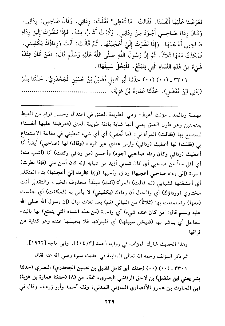 فَعَرَضْنَا عَلَيهَا أَنْفُسَنَا. فَقَالتْ: مَا تُعْطِي؟ فَقُلْتُ: رِدَائِي. وَقَال صَاحِبِي: رِدَائِي. وَكَانَ رِدَاءُ صَاحِبي أَجْوَدَ مِنْ رِدَائِي. وَكُنْتُ أَشَبُّ مِنْهُ. فَإِذَا نَظَرَتْ إِلَى رِدَاءِ صَاحِبِي أَعْجَبَهَا. وَإِذَا نَظَرَتْ إِلَيَّ أَعْجَبْتُهَا. ثُمَّ قَالتْ: أَنْتَ وَرِدَاؤُكَ يَكْفِينِي. فَمَكَثْتُ مَعَهَا ثَلَاثًا. ثُمَّ إِنَّ رَسُولَ اللهِ صَلَّى اللَّهُ عَلَيهِ وَسَلَّمَ قَال: "مَنْ كَانَ عِنْدَهُ شَيءٌ مِنْ هذِهِ النَّسَاءِ الَّتِي يَتَمَتَعُ، فَلْيُخَلِّ سَبِيلَهَا".