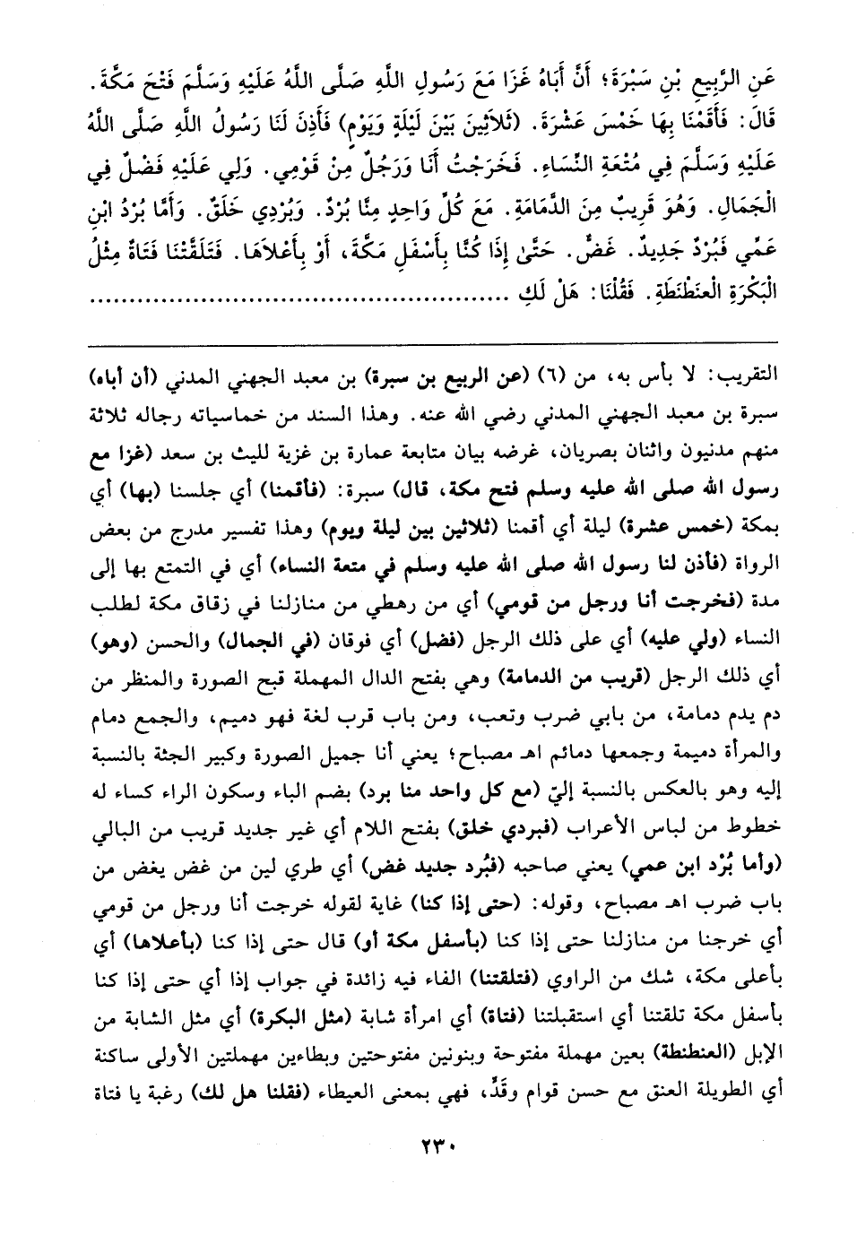 عَنِ الرَّبِيعِ بنِ سَبْرَةَ؛ أَن أَبَاهُ غَزَا مَعَ رَسُولِ اللهِ صَلَّى اللهُ عَلَيهِ وَسَلَّمَ فَتحَ مَكةَ. قَال: فَأَقَمنَا بِهَا خَمْسَ عَشرَةَ. (ثَلَاثِينَ بَينَ لَيلَةٍ وَيوْمٍ) فَأذِنَ لَنَا رَسُولُ اللهِ صَلَّى اللهُ عَلَيهِ وَسَلَّمَ في مُتعَةِ النِّسَاءِ. فَخَرَجْتُ أَنَّا وَرَجُلٌ مِن قَوْمِي. وَلِي عَلَيهِ فَضلٌ في الْجَمَالِ. وَهُوَ قَرِيبٌ مِنَ الدَّمَامَةِ. مَعَ كُلِّ وَاحِدٍ مِنَّا بُرْدٌ. وَبُردِي خَلَقٌ. وَأَمَّا بُرْدُ ابْنِ عَمِّي فَبُرْدٌ جَدِيدٌ. غَضٌّ. حَتَّى إِذَا كُنَّا بِأَسْفَلِ مَكَّةَ، أَو بِأَعْلَاهَا. فَتَلَقَّتنَا فَتَاةٌ مِثلُ البَكرَةِ الْعنَطنَطَةِ. فَقُلنَا: هَل لَكِ