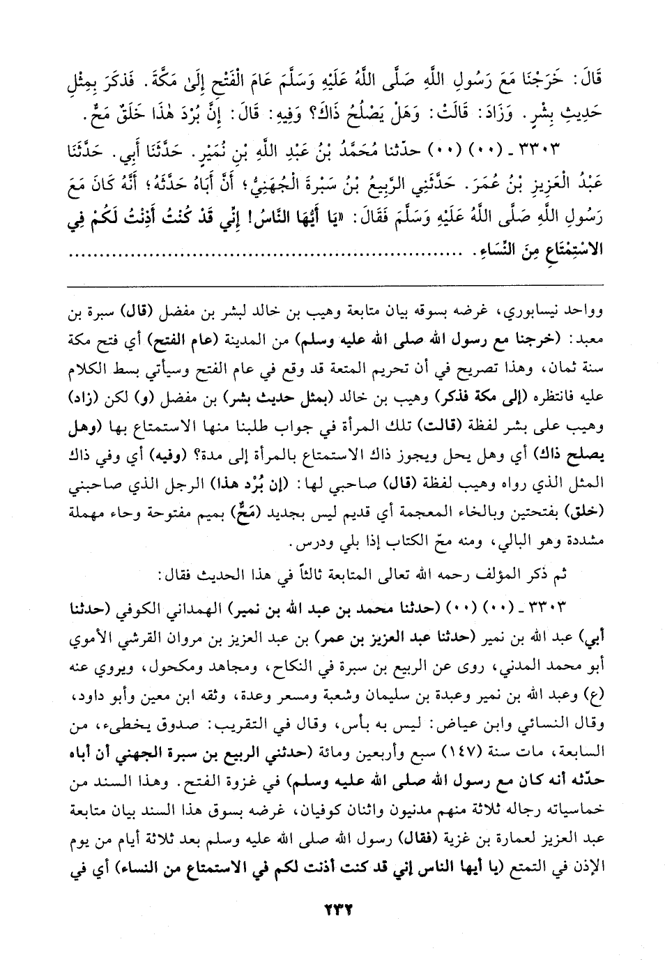 ٣٣٠٣ - (٠٠) (٠٠) (حَدَّثَنَا محمد بن عبد الله بن نمير) الهمداني الكوفي (حَدَّثَنَا أبي) عبد الله بن نمير (حَدَّثَنَا عبد العزيز بن عمر) بن عبد العزيز بن مروان القرشي الأموي أبو محمد المدني، روى عن الربيع بن سبرة في النِّكَاح، ومجاهد ومكحول، ويروي عنه (ع) وعبد الله بن نمير وعبدة بن سليمان وشعبة ومسعر وعدة، وثقه ابن معين وأبو داود، وقال النسائي وابن عياض: ليس به بأس، وقال في التقريب: صدوق يخطئ، من السابعة، مات سنة (١٤٧) سبع وأربعين ومائة (حدثني الربيع بن سبرة الجهني أن أباه حدّثه أنَّه كان مع رسول الله صلى الله عليه وسلم) في غزوة الفتح. وهذا السند من خماسياته رجاله ثلاثة منهم مدنيون واثنان كوفيان، غرضه بسوق هذا السند بيان متابعة عبد العزيز لعمارة بن غزية (فقال) رسول الله صلى الله عليه وسلم بعد ثلاثة أيام من يوم الإذن في التمتع (يا أيها الناس إني قد كنت أذنت لكم في الاستمتاع من النساء) أي في