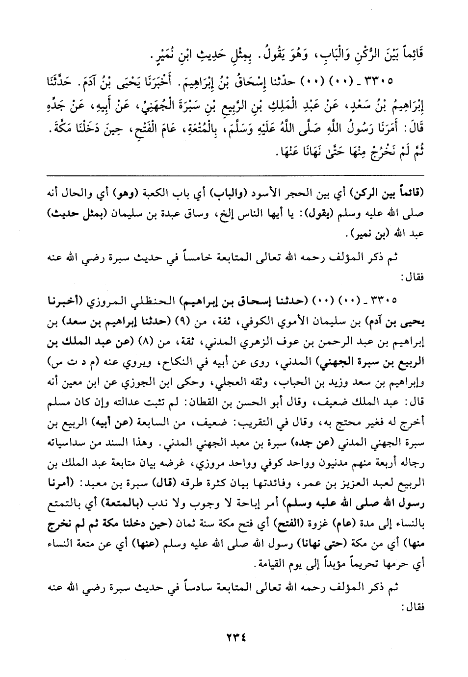 ٣٣٠٥ - (٠٠) (٠٠) (حَدَّثَنَا إسحاق بن إبراهيم) الحنظلي المروزي (أخبرنا يحيى بن آدم) بن سليمان الأموي الكوفي، ثقة، من (٩) (حَدَّثَنَا إبراهيم بن سعد) بن إبراهيم بن عبد الرحمن بن عوف الزهري المدني، ثقة، من (٨) (عن عبد الملك بن الربيع بن سبرة الجهني) المدني، روى عن أبيه في النِّكَاح، ويروي عنه (م د ت س) وإبراهيم بن سعد وزيد بن الحباب، وثقه العجلي، وحكى ابن الجوزي عن ابن معين أنَّه قال: عبد الملك ضعيف، وقال أبو الحسن بن القطان: لم تثبت عدالته وإن كان مسلم أخرج له فغير محتج به، وقال في التقريب: ضعيف، من السابعة (عن أبيه) الربيع بن سبرة الجهني المدني (عن جده) سبرة بن معبد الجهني المدني. وهذا السند من سداسياته رجاله أربعة منهم مدنيون وواحد كوفي وواحد مروزي، غرضه بيان متابعة عبد الملك بن الربيع لعبد العزيز بن عمر، وفائدتها بيان كثرة طرقه (قال) سبرة بن معبد: (أمرنا رسول الله صلى الله عليه وسلم) أمر إباحة لا وجوب ولا ندب (بالمتعة) أي بالتمتع بالنساء إلى مدة (عام) غزوة (الفتح) أي فتح مكة سنة ثمان (حين دخلنا مكة ثم لم نخرج منها) أي من مكة (حتَّى نهانا) رسول الله صلى الله عليه وسلم (عنها) أي عن متعة النساء أي حرمها تحريمًا مؤبدًا إلى يوم القيامة.