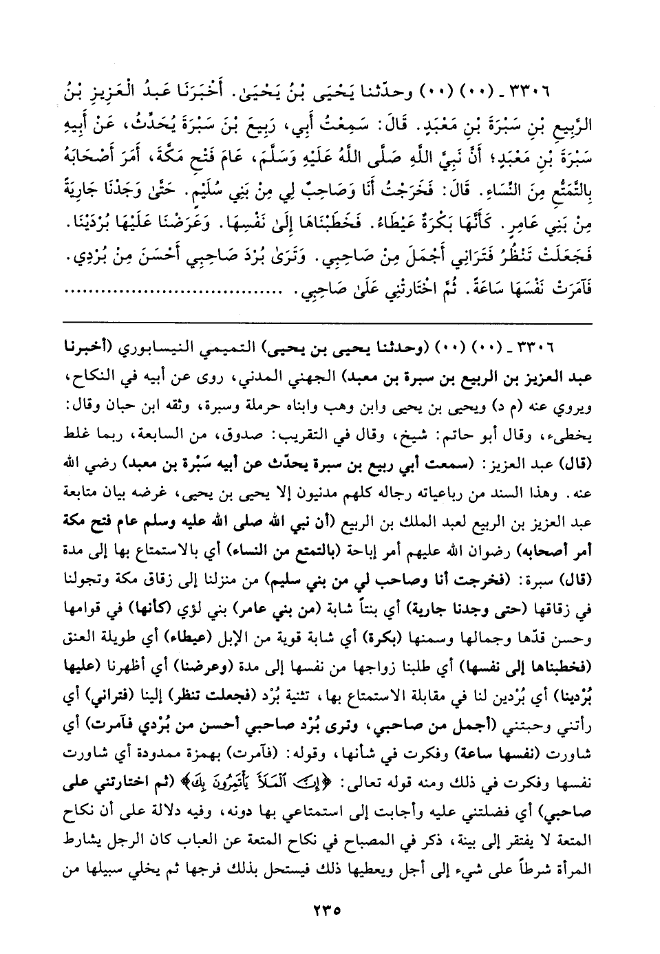 ٣٣٠٦ - (٠٠) (٠٠) وحدَّثنا يَحيَى بن يَحيَى. أَخبَرَنَا عَبدُ الْعَزِيزِ بن الرَّبِيعِ بْنِ سَبْرَةَ بنِ مَعْبَدٍ. قَال: سَمِعْتُ أَبِي، رَبِيعَ بنَ سَبرَةَ يُحدِّثُ، عَنْ أَبِيهِ سَبرَةَ بنِ مَعْبَدٍ؛ أَنَّ نَبِيَّ اللهِ صَلَّى اللهُ عَلَيهِ وَسَلَّمَ، عَامَ فَتحِ مَكةَ، أَمَرَ أَصْحَابَهُ بِالتَّمَتُّعِ مِنَ النِّسَاءِ. قَال: فَخَرَجْتُ أَنَا وَصَاحِبٌ لِي مِن بَنِي سُلَيمٍ. حَتَّى وَجَدْنَا جَارِيةً مِنْ بَنِي عَامِرٍ. كَأَنَّهَا بَكرَةٌ عَيْطَاءُ. فَخَطَبْنَاهَا إِلَى نَفْسِهَا. وَعَرَضْنَا عَلَيهَا بُرْدَينَا. فَجَعَلَتْ تَنْظُرُ فَتَرَانِي أَجْمَلَ مِنْ صَاحِبِي. وَتَرَى بُرْدَ صَاحِبِي أَحْسَنَ مِن بُرْدِي. فَأَمَرَتْ نَفْسَهَا سَاعَةً. ثُمَّ اختَارتْنِي عَلَى صَاحِبِي