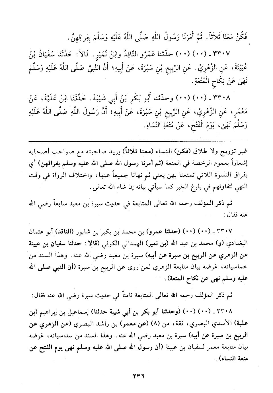 ٣٣٠٧ - (٠٠) (٠٠) (حَدَّثَنَا عمرو) بن محمد بن بكير بن شابور (الناقد) أبو عثمان البغدادي (و) محمد بن عبد الله (بن نمير) الهمداني الكوفي (قالا: حَدَّثَنَا سفيان بن عيينة عن الزهري عن الربيع بن سبرة عن أبيه) سبرة بن معبد رضي الله عنه. وهذا السند من خماسياته، غرضه بيان متابعة الزهري لمن روى عن الربيع بن سبرة (أن النبي صلى الله عليه وسأنهى عن نكاح المتعة).