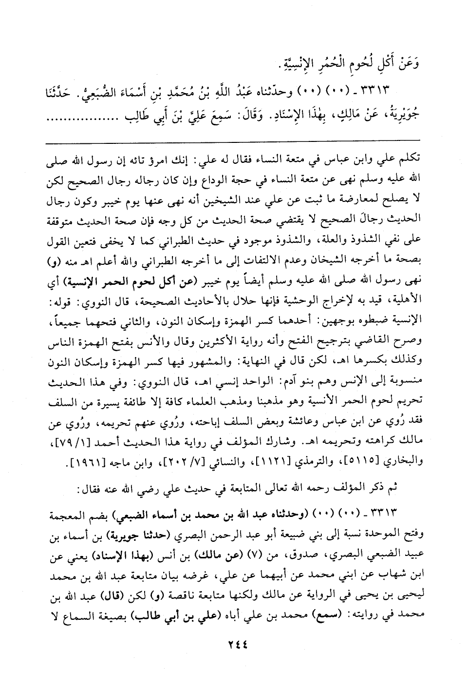 تكلم علي وابن عباس في متعة النساء فقال له علي: إنك امرؤ تائه إن رسول الله صلى الله عليه وسأنهى عن متعة النساء في حجة الوداع وإن كان رجاله رجال الصحيح لكن لا يصلح لمعارضة ما ثبت عن علي عند الشيخين أنَّه نهى عنها يوم خيبر وكون رجال الحديث رجال الصحيح لا يقتضي صحة الحديث من كل وجه فإن صحة الحديث متوقفة على نفي الشذوذ والعلة، والثذوذ موجود في حديث الطبراني كما لا يخفى فتعين القول بصحة ما أخرجه الشيخان وعدم الالتفات إلى ما أخرجه الطبراني والله أعلم اهـ منه (و) نهى رسول الله صلى الله عليه وسلم أيضًا يوم خيبر (عن أكل لحوم الحمر الإنسية) أي الأهلية، قيد به لإخراج الوحشية فإنها حلال بالأحاديث الصحيحة، قال النووي: قوله: الإنسية ضبطوه بوجهين: أحدهما كسر الهمزة وإسكان النون، والثاني فتحهما جميعًا، وصرح القاضي بترجيح الفتح وأنه رواية الأكثرين وقال والإنس بفتح الهمزة الناس وكذلك بكسرها اهـ، لكن قال في النهاية: والمشهور فيها كسر الهمزة وإسكان النون منسوبة إلى الإنس وهم بنو آدم: الواحد إنسي اهـ، قال النووي: وفي هذا الحديث تحريم لحوم الحمر الإنسية وهو مذهبنا ومذهب العلماء كافة إلَّا طائفة يسيرة من السلف فقد رُوي عن ابن عباس وعائشة وبعض السلف إباحته، ورُوي عنهم تحريمه، ورُوي عن مالك كراهته وتحريمه اهـ. وشارك المؤلف في رواية هذا الحديث أحمد [١/ ٧٩]، والبخاري [٥١١٥]، والترمذي [١١٢١]، والنسائي [٧/ ٢٥٢]، وابن ماجة [١٩٦١].