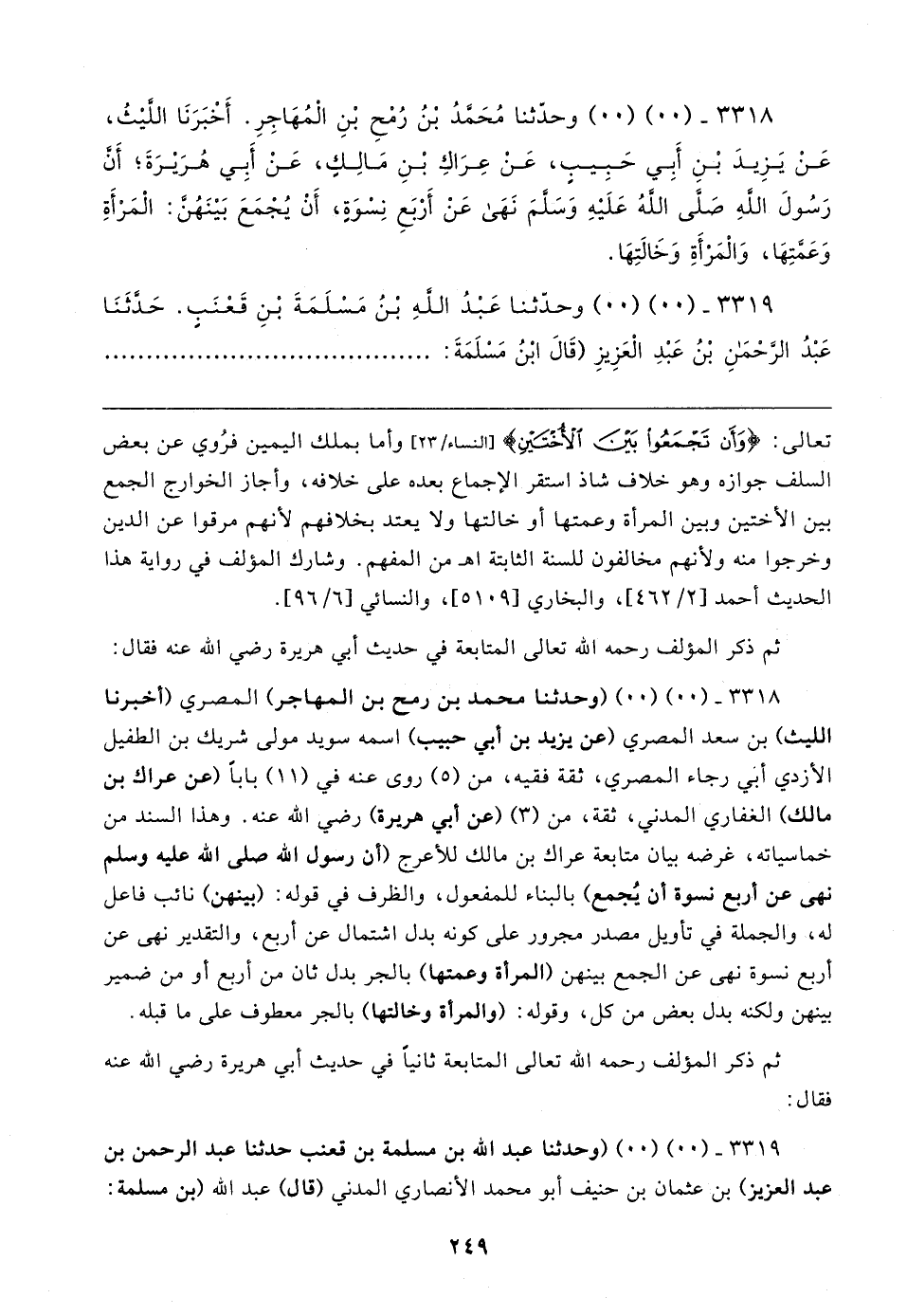 ٣٣١٨ - (٠٠) (٠٠) (وحدثنا محمد بن رمح بن المهاجر) المصري (أخبرنا الليث) بن سعد المصري (عن يزيد بن أبي حبيب) اسمه سويد مولى شريك بن الطفيل الأزدي أبي رجاء المصري، ثقة فقيه، من (٥) روى عنه في (١١) بابا (عن عراك بن مالك) الغفاري المدني، ثقة، من (٣) (عن أبي هريرة) رضي الله عنه. وهذا السند من خماسياته، غرضه بيان متابعة عراك بن مالك للأعرج (أن رسول الله صلى الله عليه وسلم نهى عن أربع نسوة أن يُجمع) بالبناء للمفعول، والظرف في قوله: (بينهن) نائب فاعل له، والجملة في تأويل مصدر مجرور على كونه بدل اشتمال عن أربع، والتقدير نهى عن أربع نسوة نهى عن الجمع بينهن (المرأة وعمتها) بالجر بدل ثان من أربع أو من ضمير بينهن ولكنه بدل بعض من كل، وقوله: (والمرأة وخالتها) بالجر معطوف على ما قبله.