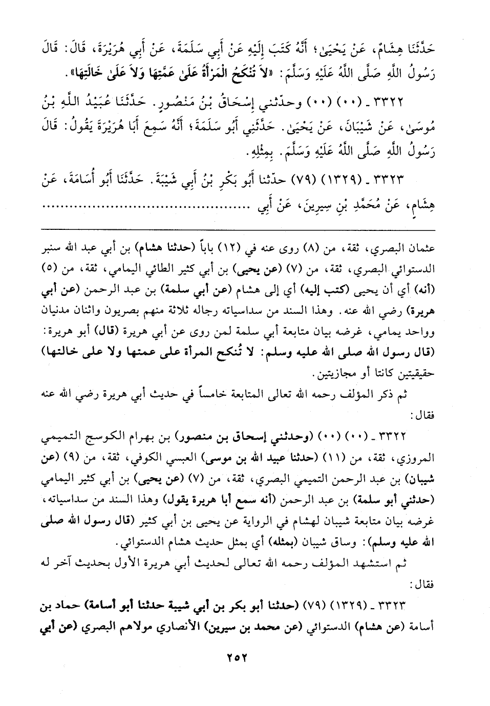 ٣٣٢٢ - (٠٠) (٠٠) (وحثني إسحاق بن منصور) بن بهرام الكوسج التميمي المروزي، ثقة، من (١١) (حَدَّثَنَا عبيد الله بن موسى) العبسي الكوفي، ثقة، من (٩) (عن شيبان) بن عبد الرحمن التميمي البصري، ثقة، من (٧) (عن يحيى) بن أبي كثير اليمامي (حدثني أبو سلمة) بن عبد الرحمن (أنه سمع أبا هريرة يقول) وهذا السند من سداسياته، غرضه بيان متابعة شيبان لهشام في الرواية عن يحيى بن أبي كثير (قال رسول الله صلى الله عليه وسلم): وساق شيبان (بمثله) أي بمثل حديث هشام الدستوائي.