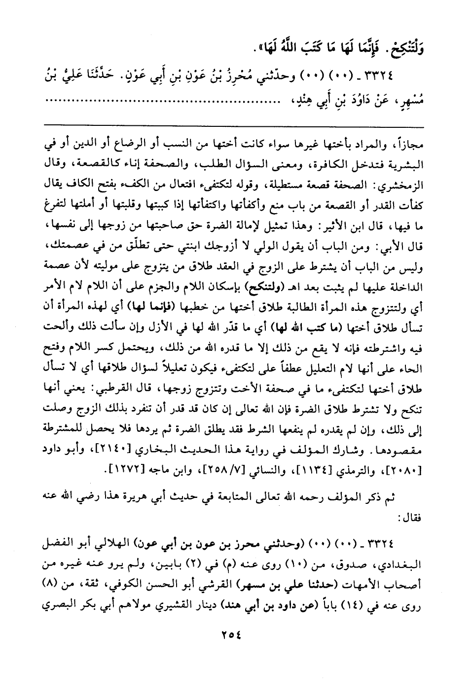 مجازًا، والمراد بأختها غيرها سواء كانت أختها من النسب أو الرضاع أو الدين أو في البشرية فتدخل الكافرة، ومعنى السؤال الطلب، والصحفة إناء كالقصعة، وقال الزمخشري: الصحفة قصعة مستطيلة، وقوله لتكتفئ افتعال من الكفء بفتح الكاف يقال كفأت القدر أو القصعة من باب منع وأكفاتها واكتفاتها إذا كببتها وقلبتها أو أملتها لتفرغ ما فيها، قال ابن الأثير: وهذا تمثيل لإمالة الضرة حق صاحبتها من زوجها إلى نفسها، قال الأبي: ومن الباب أن يقول الولي لا أزوجك ابنتي حتَّى تطلّق من في عصمتك، وليس من الباب أن يشترط على الزوج في العقد طلاق من يتزوج على موليته لأن عصمة الداخلة عليها لم يثبت بعد اهـ (ولتنكح) بإسكان اللام والجزم على أن اللام لام الأمر أي ولتتزوج هذه المرأة الطالبة طلاق أختها من خطبها (فإنما لها) أي لهذه المرأة أن تسأل طلاق أختها (ما كتب الله لها) أي ما قدَّر الله لها في الأزل وإن سألت ذلك وألحت فيه واشترطته فإنه لا يقع من ذلك إلَّا ما قدره الله من ذلك، ويحتمل كسر اللام وفتح الحاء على أنها لام التعليل عطفًا على لتكتفئ فيكون تعليلًا لسؤاك طلاقها أي لا تسأل طلاق أختها لتكتفئ ما في صحفة الأخت وتتزوج زوجها، قال القرطبي: يعني أنها تنكح ولا تشترط طلاق الضرة فإن الله تعالى إن كان قد قدر أن تنفرد بذلك الزوج وصلت إلى ذلك، وإن لم يقدره لم ينفعها الشرط فقد يطلق الضرة ثم يردها فلا يحصل للمشترطة مقصودها. وشارك المؤلف في رواية هذا الحديث البخاري [٢١٤٠]، وأبو داود [٢٠٨٠]، والترمذي [١١٣٤]، والنسائي [٧/ ٢٥٨]، وابن ماجة [١٢٧٢].