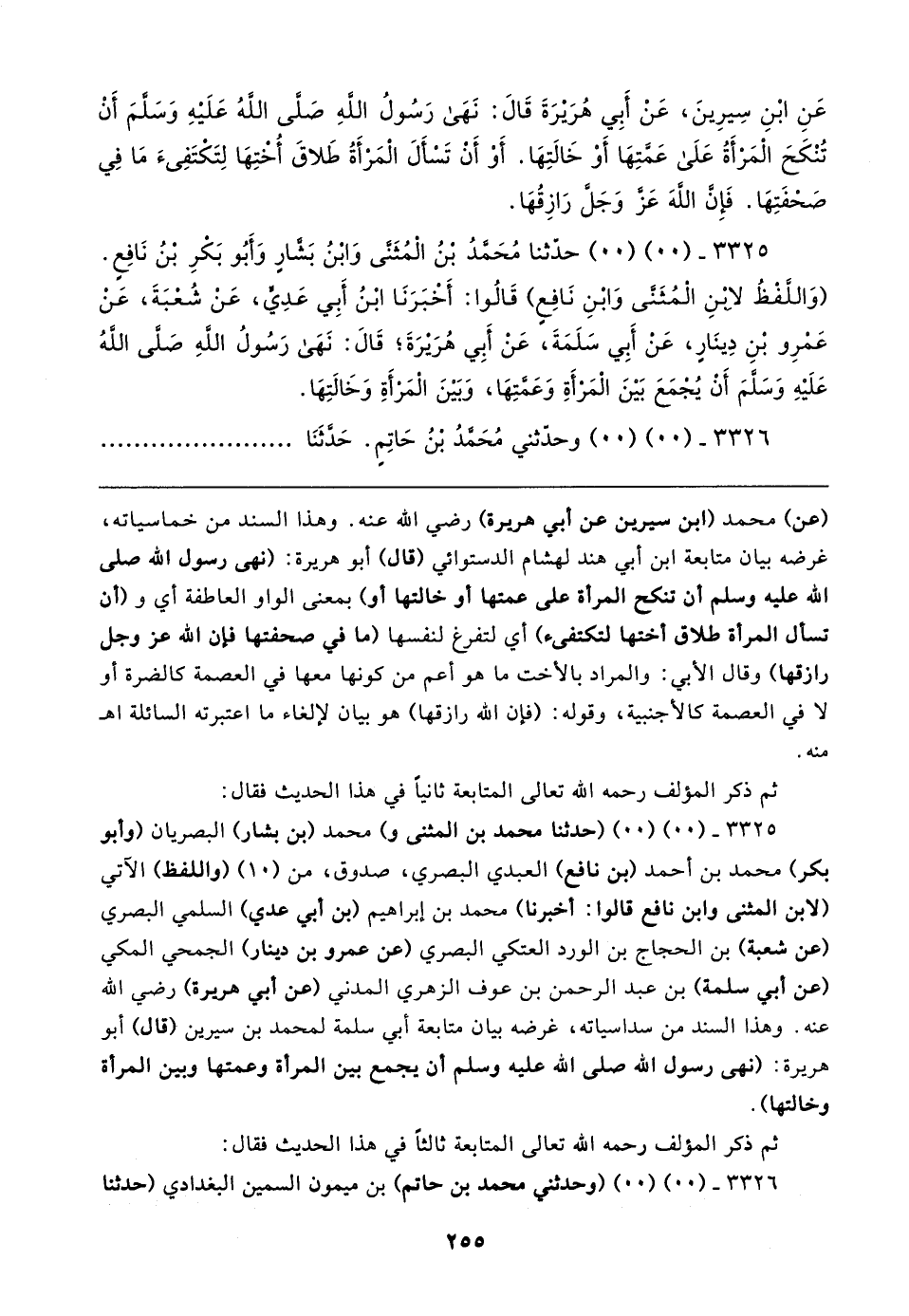 ٣٣٢٥ - (٠٠) (٠٠) (حَدَّثَنَا محمد بن المثنى و) محمد (بن بشار) البصريان (وأبو بكر) محمد بن أحمد (بن نافع) العبدي البصري، صدوق، من (١٠) (واللفظ) الآتي (لابن المثنى وابن نافع قالوا: أخبرنا) محمد بن إبراهيم (بن أبي عدي) السلمي البصري (عن شعبة) بن الحجاج بن الورد العتكي البصري (عن عمرو بن دينار) الجمحي المكي (عن أبي سلمة) بن عبد الرحمن بن عوف الزهري المدني (عن أبي هريرة) رضي الله عنه. وهذا السند من سداسياته، غرضه بيان متابعة أبي سلمة لمحمد بن سيرين (قال) أبو هريرة: (نهى رسول الله صلى الله عليه وسلم أن يجمع بين المرأة وعمتها وبين المرأة وخالتها).