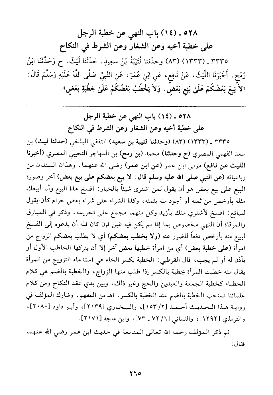 ٣٣٣٥ - (١٣٣٣) (٨٣) وحدَّثنا قُتَيبَةُ بْنُ سَعِيدٍ. حَدَّثَنَا لَيثٌ. ح وَحدَّثَنَا ابْنُ رُمْحٍ. أَخْبَرَنَا اللَّيثُ، عَنْ نَافِعٍ، عَنِ ابْنِ عُمَرَ، عَنِ النَّبِيِّ صَلَّى اللهُ عَلَيهِ وَسَلَّمَ قَال: "لَا يَبعْ بَعْضُكُمْ عَلَى بَيعِ بَعْضٍ. وَلَا يَخْطُبْ بَعْضُكُمْ عَلَى خِطْبَةِ بَعْضٍ"