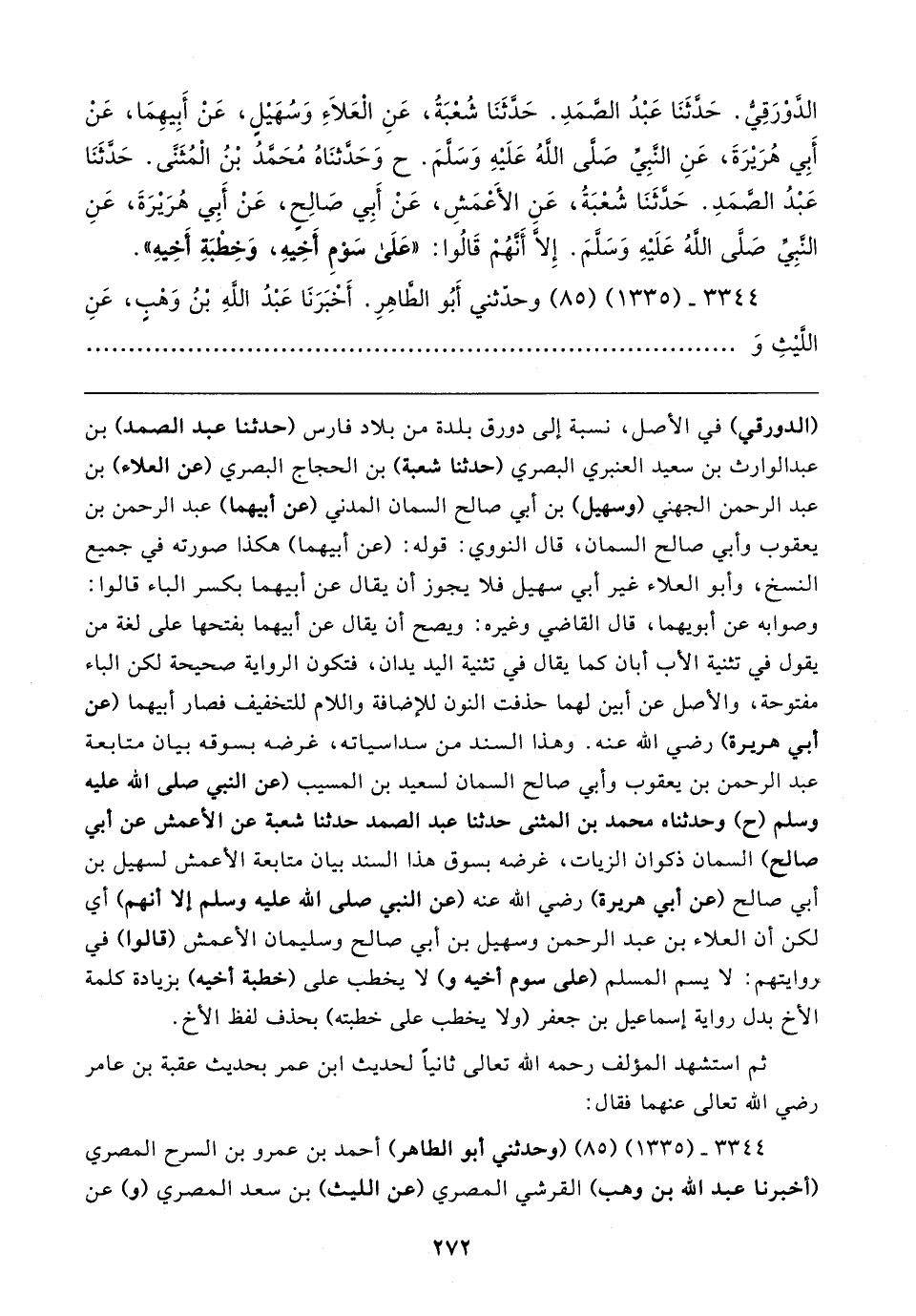 الدَّوْرَقِيُّ. حَدَّثَنَا عَبْدُ الصَّمَدِ. حَدَّثَنَا شُعْبَةُ، عَنِ الْعَلَاءِ وَسُهَيلٍ، عَنْ أَبِيهِمَا، عَنْ أَبِي هُرَيرَةَ، عَنِ النَّبِيِّ صَلَّى اللهُ عَلَيهِ وَسَلَّمَ. ح وَحدَّثنَاهُ مُحَمَّدُ بْنُ الْمُثَنَّى. حَدَّثَنَا عَبْدُ الصَّمَدِ. حَدَّثَنَا شُعْبَةُ، عَنِ الأعمَشِ، عَنْ أَبِي صَالِحٍ، عَنْ أَبِي هُرَيرَةَ، عَنِ النَّبِيِّ صَلَّى اللهُ عَلَيهِ وَسَلَّمَ. إلا أَنهُمْ قَالُوا: "عَلَى صَوْمِ أَخِيهِ، وَخِطْبَةِ أَخِيهِ".