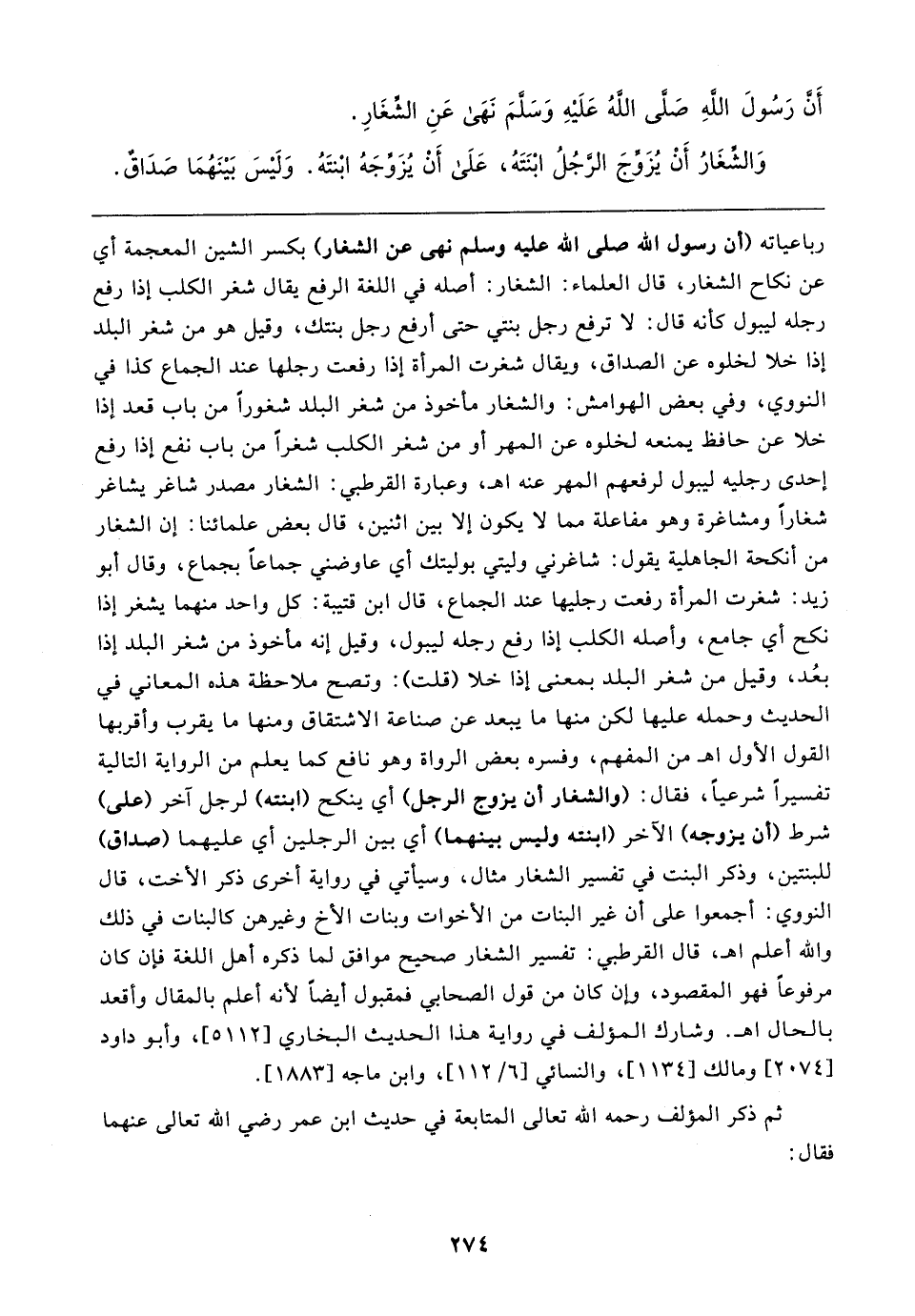 أَنَّ رَسُولَ اللهِ صَلَّى اللهُ عَلَيهِ وَسَلَّمَ نَهَى عَنِ الشِّغَارِ.