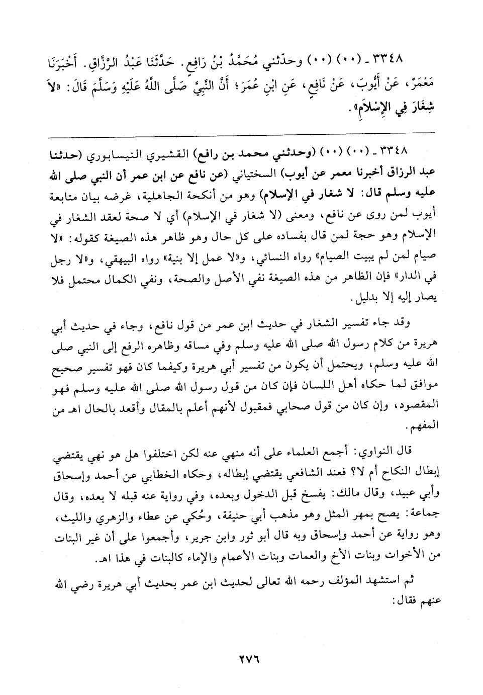 ٣٣٤٨ - (٠٠) (٠٠) وحدَّثني مُحَمَّدُ بْنُ رَافِعٍ. حَدَّثَنَا عَبْدُ الرَّزَّاقِ. أَخْبَرَنَا مَعْمَرٌ، عَنْ أَيُّوبَ، عَنْ نَافِعٍ، عَنِ ابْنِ عُمَرَ؛ أَنَّ النَّبِيَّ صَلَّى اللهُ عَلَيهِ وَسَلَّمَ قَال: "لَا شِغَارَ فِي الإِسْلَامِ"