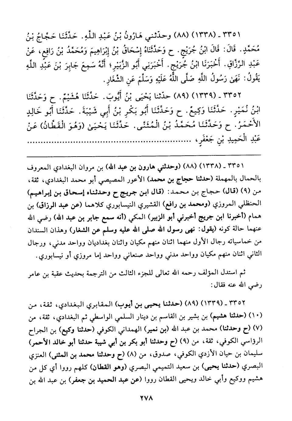 ٣٣٥١ - (١٣٣٨) (٨٨) (وحدثني هارون بن عبد الله) بن مروان البغدادي المعروف بالحمال بالمهملة (حدثنا حجاج بن محمد) الأعور المصيصي أبو محمد البغدادي، ثقة، من (٩) (قال) حجاج بن محمد: (قال ابن جريج ح وحدثناه إسحاق بن إبراهيم) الحنظلي المروزي (ومحمد بن رافع) القشيري النيسابوري كلاهما (عن عبد الرزاق) بن همام (أخبرنا ابن جريج أخبرني أبو الزبير) المكي (أنه سمع جابر بن عبد الله) رضي الله عنهما حالة كونه (يقول: نهى رسول الله صلى الله عليه وسلم عن الشغار) وهذان السندان من خماسياته رجال الأول منهما اثنان منهم مكيان واثنان بغداديان وواحد مدني، ورجال الثاني اثنان منهم مكيان وواحد مدني وواحد صنعاني وواحد إما مروزي أو نيسابوري.