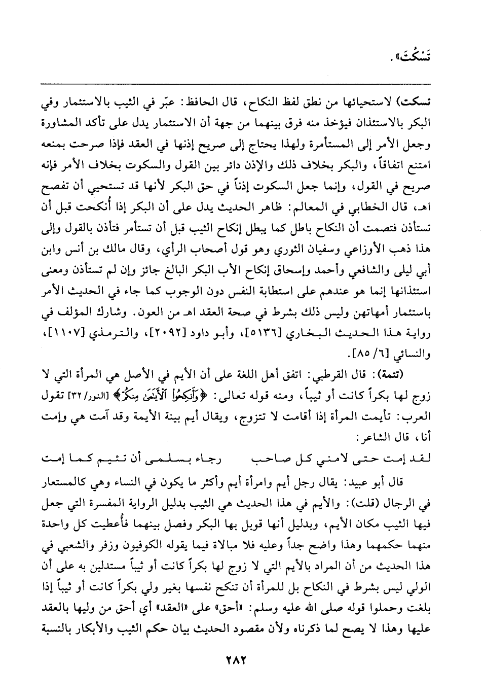 تسكت) لاستحيائها من نطق لفظ النكاح، قال الحافظ: عبّر في الثيب بالاستئمار وفي البكر بالاستئذان فيؤخذ منه فرق بينهما من جهة أن الاستئمار يدل على تأكد المشاورة وجعل الأمر إلى المستأمرة ولهذا يحتاج إلى صريح إذنها في العقد فإذا صرحت بمنعه امتنع اتفاقًا، والبكر بخلاف ذلك والإذن دائر بين القول والسكوت بخلاف الأمر فإنه صريح في القول، وإنما جعل السكوت إذنًا في حق البكر لأنها قد تستحيي أن تفصح اهـ، قال الخطابي في المعالم: ظاهر الحديث يدل على أن البكر إذا أُنكحت قبل أن تستأذن فتصمت أن النكاح باطل كما يبطل إنكاح الثيب قبل أن تستأمر فتأذن بالقول وإلى هذا ذهب الأوزاعي وسفيان الثوري وهو قول أصحاب الرأي، وقال مالك بن أنس وابن أبي ليلى والشافعي وأحمد وإسحاق إنكاح الأب البكر البالغ جائز وإن لم تستأذن ومعنى استئذانها إنما هو عندهم على استطابة النفس دون الوجوب كما جاء في الحديث الأمر باستئمار أمهاتهن وليس ذلك بشرط في صحة العقد اهـ من العون. وشارك المؤلف في رواية هذا الحديث البخاري [٥١٣٦]، ، وأبو داود [٢٠٩٢]، والترمذي [١١٠٧]، والنسائي [٦/ ٨٥].