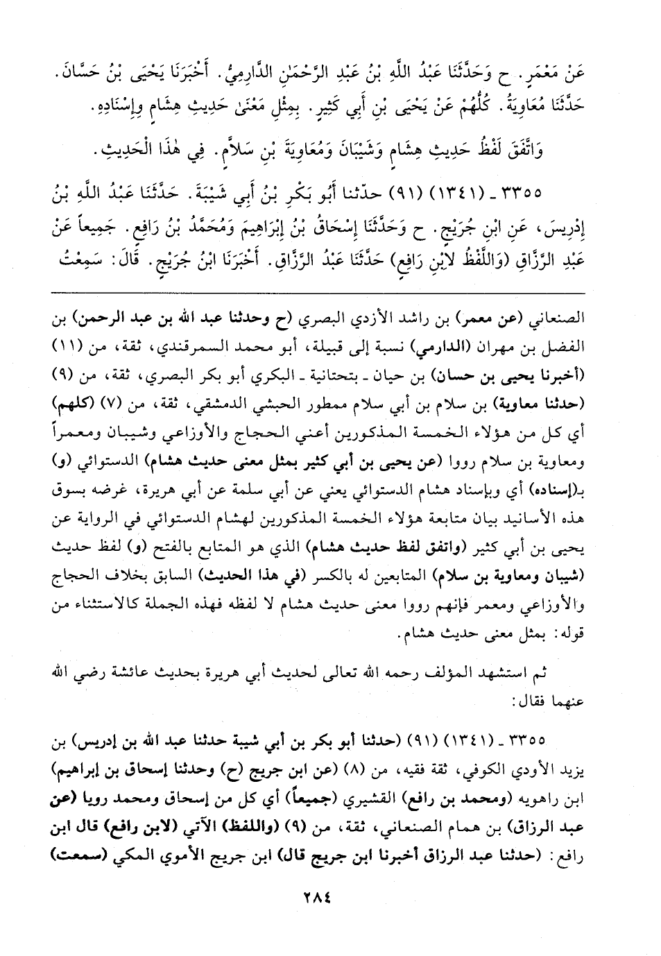 الصنعاني (عن معمر) بن راشد الأزدي البصري (ح وحدثنا عبد الله بن عبد الرحمن) بن الفضل بن مهران (الدارمي) نسبة إلى قبيلة، أبو محمد السمرقندي، ثقة، من (١١) (أخبرنا يحيى بن حسان) بن حيان- بتحتانية- البكري أبو بكر البصري، ثقة، من (٩) (حدثنا معاوية) بن سلام بن أبي سلام ممطور الحبشي الدمشقي، ثقة، من (٧) (كلهم) أي كل من هؤلاء الخمسة المذكورين أعني الحجاج والأوزاعي وشيبان ومعمرًا ومعاوية بن سلام رووا (عن يحيى بن أبي كثير بمثل معنى حديث هشام) الدستوائي (و) بـ (إسناده) أي وبإسناد هشام الدستوائي يعني عن أبي سلمة عن أبي هريرة، غرضه بسوق هذه الأسانيد بيان متابعة هؤلاء الخمسة المذكورين لهشام الدستوائي في الرواية عن يحيى بن أبي كثير (واتفق لفظ حديث هشام) الذي هو المتابع بالفتح (و) لفظ حديث (شيبان ومعاوية بن سلام) المتابعين له بالكسر (في هذا الحديث) السابق بخلاف الحجاج والأوزاعي ومعمر فإنهم رووا معنى حديث هشام لا لفظه فهذه الجملة كالاستثناء من قوله: بمثل معنى حديث هشام.