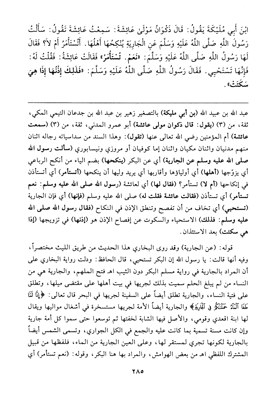 قوله: (عن الجارية) وقد روى البخاري هذا الحديث من طريق الليث مختصرًا، وفيه أنها قالت: يا رسول الله إن البكر تستحيي، قال الحافظ: ودلت رواية البخاري على أن المراد بالجارية في رواية مسلم البكر دون الثيب اهـ فتح الملهم، والجارية هي من النساء من لم يبلغ الحلم سميت بذلك لجريها في بيت أهلها على مقتضى ميلها، وتطلق على فتية النساء، والجارية تطلق أيضًا على السفينة لجريها في البحر قال تعالى: (إِنَّا لَمَّا طَغَى الْمَاءُ حَمَلْنَاكُمْ فِي الْجَارِيَةِ) والجارية أيضًا الأمة لجريها مستسخرة في أشغال مواليها ويقال لها ابنة اقعدي وقومي، والأصل فيها الشابة لخفتها ثم توسعوا حتى سموا كل أمة جارية وإن كانت مسنة تسمية بما كانت عليه والجمع في الكل الجواري، وتسمى الشمس أيضًا بالجارية لكونها تجري لمستقر لها، وعلى العين الجارية من الماء، فلفظها من قبيل المشترك اللفظي اهـ من بعض الهوامش، والمراد بها هنا البكر، وقوله: (نعم تستأمر) أي