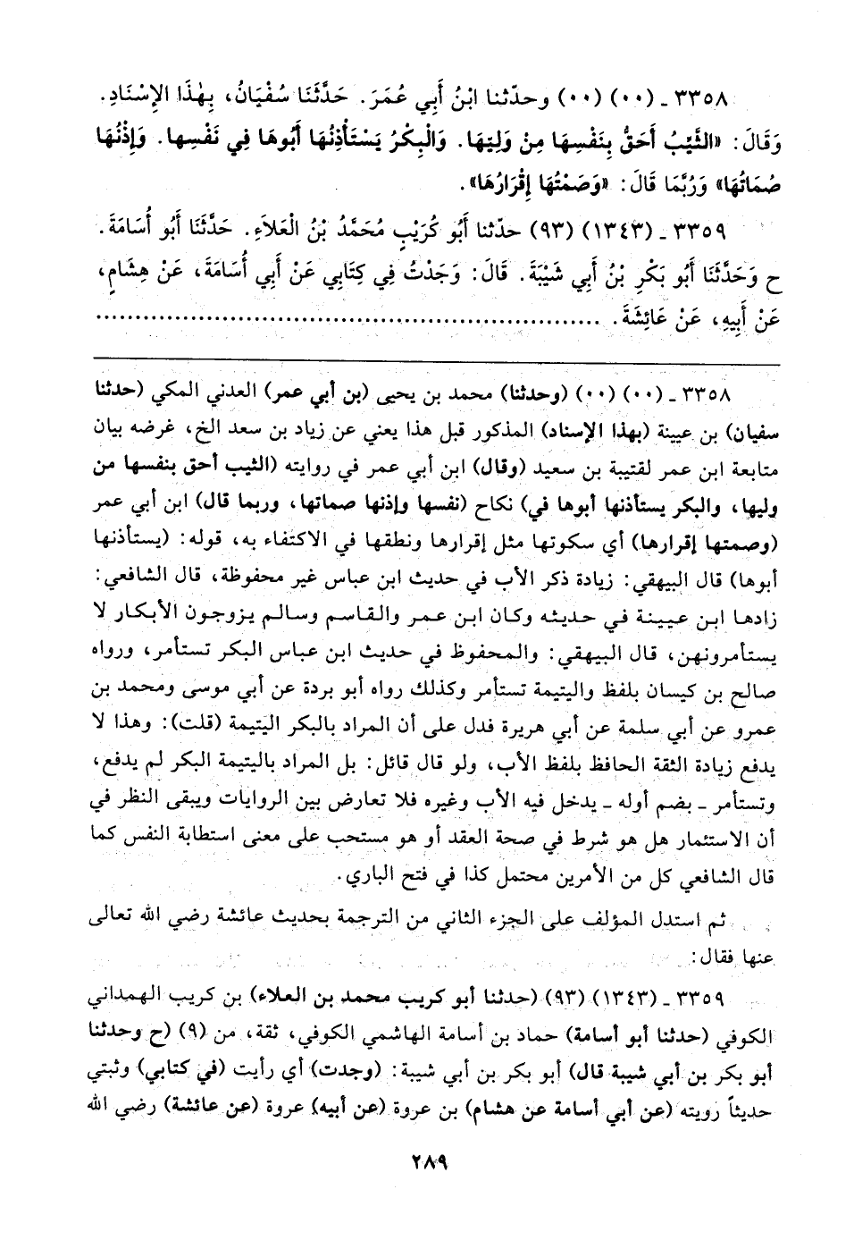 ٣٣٥٨ - (٠٠) (٠٠) (وحدثنا) محمد بن يحيى (بن أبي عمر) العدني المكي (حدثنا سفيان) بن عيينة (بهذا الإسناد) المذكور قبل هذا يعني عن زياد بن سعد الخ، غرضه بيان متابعة ابن عمر لقتيبة بن سعيد (وقال) ابن أبي عمر في روايته (الثيب أحق بنفسها من وليها، والبكر يستأذنها أبوها في) نكاح (نفسها وإذنها صماتها، وربما قال) ابن أبي عمر (وصمتها إقرارها) أي سكوتها مثل إقرارها ونطقها في الاكتفاء به، قوله: (يستاذنها أبوها) قال البيهقي: زيادة ذكر الأب في حديث ابن عباس غير محفوظة، قال الشافعي: زادها ابن عيينة في حديثه وكان ابن عمر والقاسم وسالم يزوجون الأبكار لا يستأمرونهن، قال البيهقي: والمحفوظ في حديث ابن عباس البكر تستأمر، ورواه صالح بن كيسان بلفظ واليتيمة تستأمر وكذلك رواه أبو بردة عن أبي موسى ومحمد بن عمرو عن أبي سلمة عن أبي هريرة فدل على أن المراد بالبكر اليتيمة (قلت): وهذا لا يدفع زيادة الثقة الحافظ بلفظ الأب، ولو قال قائل: بل المراد باليتيمة البكر لم يدفع، وتستأمر -بضم أوله- يدخل فيه الأب وغيره فلا تعارض بين الروايات ويبقى النظر في أن الاستئمار هل هوشرط في صحة العقد أو هو مستحب على معنى استطابة النفس كما قال الشافعي كل من الأمرين محتمل كذا في فتح الباري.