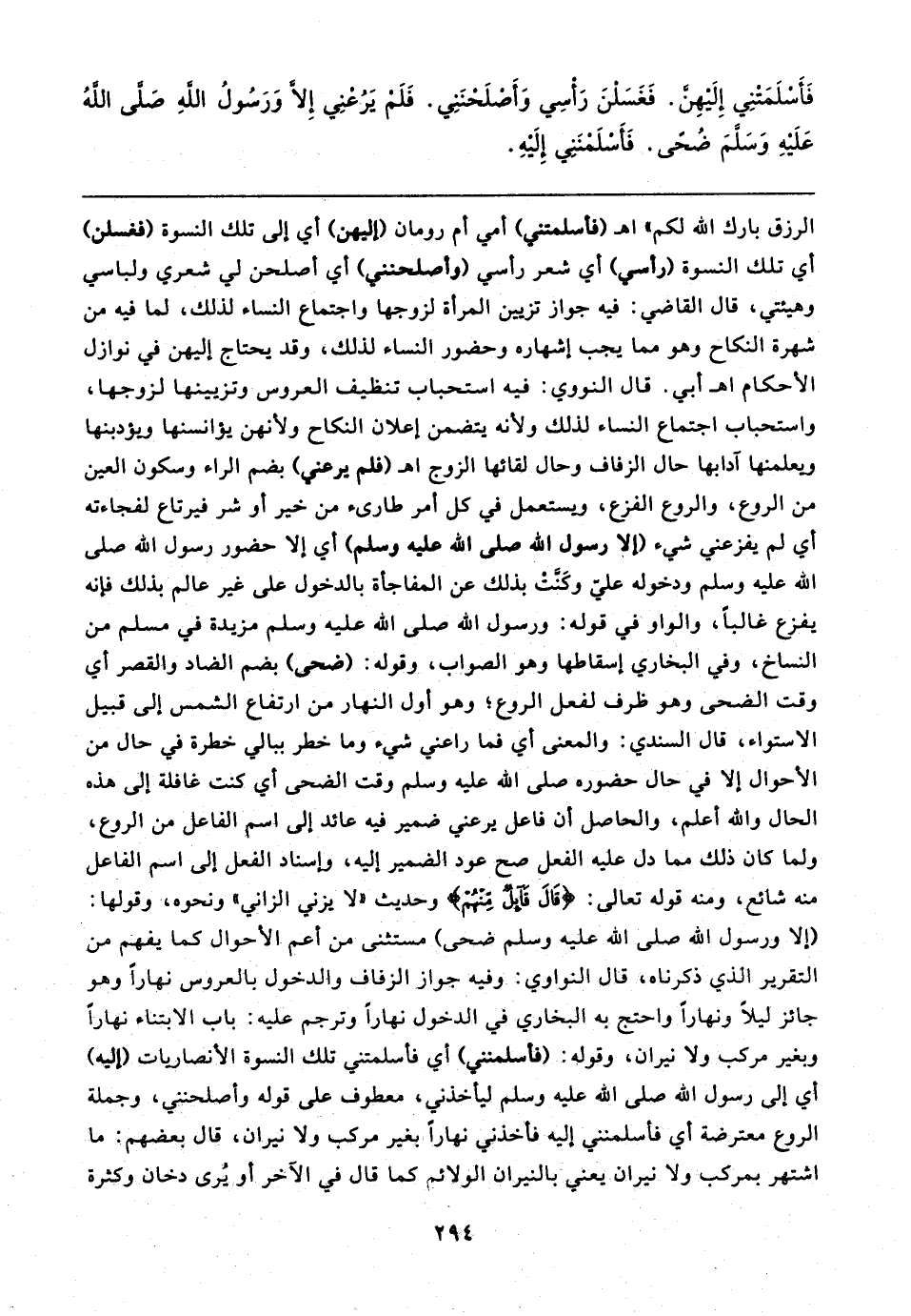 الرزق بارك الله لكم" اهـ (فأسلمتني) أمي أم رومان (إليهن) أي إلى تلك النسوة (فغسلن) أي تلك النسوة (رأسي) أي شعر رأسي (وأصلحنني) أي أصلحن لي شعري ولباسي وهيئتي، قال القاضي: فيه جواز تزيين المرأة لزوجها واجتماع النساء لذلك، لما فيه من شهرة النكاح وهو مما يجب إشهاره وحضور النساء لذلك، وقد يحتاج إليهن في نوازل الأحكام اهـ أبي. قال النووي: فيه استحباب تنظيف العروس وتزيينها لزوجها، واستحباب اجتماع النساء لذلك ولأنه يتضمن إعلان النكاح ولأنهن يؤانسنها ويؤدبنها ويعلمنها آدابها حال الزفاف وحال لقائها الزوج اهـ (فلم يرعني) بضم الراء وسكون العين من الروع، والروع الفزع، ويستعمل في كل أمر طارئ من خير أو شر فيرتاع لفجاءته أي لم يفزعني شيء (إلا رسول الله صلى الله عليه وسلم) أي إلا حضور رسول الله صلى الله عليه وسلم ودخوله عليّ وكَنَّتْ بذلك عن المفاجاة بالدخول على غير عالم بذلك فإنه يفزع غالبًا، والواو في قوله: ورسول الله صلى الله عليه وسلم مزيدة في مسلم من النساخ، وفي البخاري إسقاطها وهو الصواب، وقوله: (ضحى) بضم الضاد والقصر أي وقت الضحى وهو ظرف لفعل الروع؛ وهو أول النهار من ارتفاع الشمس إلى قبيل الاستواء، قال السندي: والمعنى أي فما راعني شيء وما خطر ببالي خطرة في حال من الأحوال إلا في حال حضوره صلى الله عليه وسلم وقت الضحى أي كنت غافلة إلى هذه الحال والله أعلم، والحاصل أن فاعل يرعني ضمير فيه عائد إلى اسم الفاعل من الروع، ولما كان ذلك مما دل عليه الفعل صح عود الضمير إليه، وإسناد الفعل إلى اسم الفاعل منه شائع، ومنه قوله تعالى: (قَال قَائِلٌ مِنْهُمْ) وحديث "لا يزني الزاني" ونحوه، وقولها: (إلا ورسول الله صلى الله عليه وسلم ضحى) مستثنى من أعم الأحوال كما يفهم من التقرير الذي ذكرناه، قال النواوي: وفيه جواز الزفاف والدخول بالعروس نهارًا وهو جائز ليلًا ونهارًا واحتج به البخاري في الدخول نهارًا وترجم عليه: باب الابتناء ثهارًا وبغير مركب ولا نيران، وقوله: (فأسلمنني) أي فأسلمتني تلك النسوة الأنصاريات (إليه) أي إلى رسول الله صلى الله عليه وسلم ليأخذني، معطوف على قوله وأصلحنني، وجملة الروع معترضة أي فأسلمنني إليه فأخذني نهارًا بغير مركب ولا نيران، قال بعضهم: ما اشتهر بمركب ولا نيران يعني بالنيران الولائم كما قال في الآخر أو يُرى دخان وكثرة