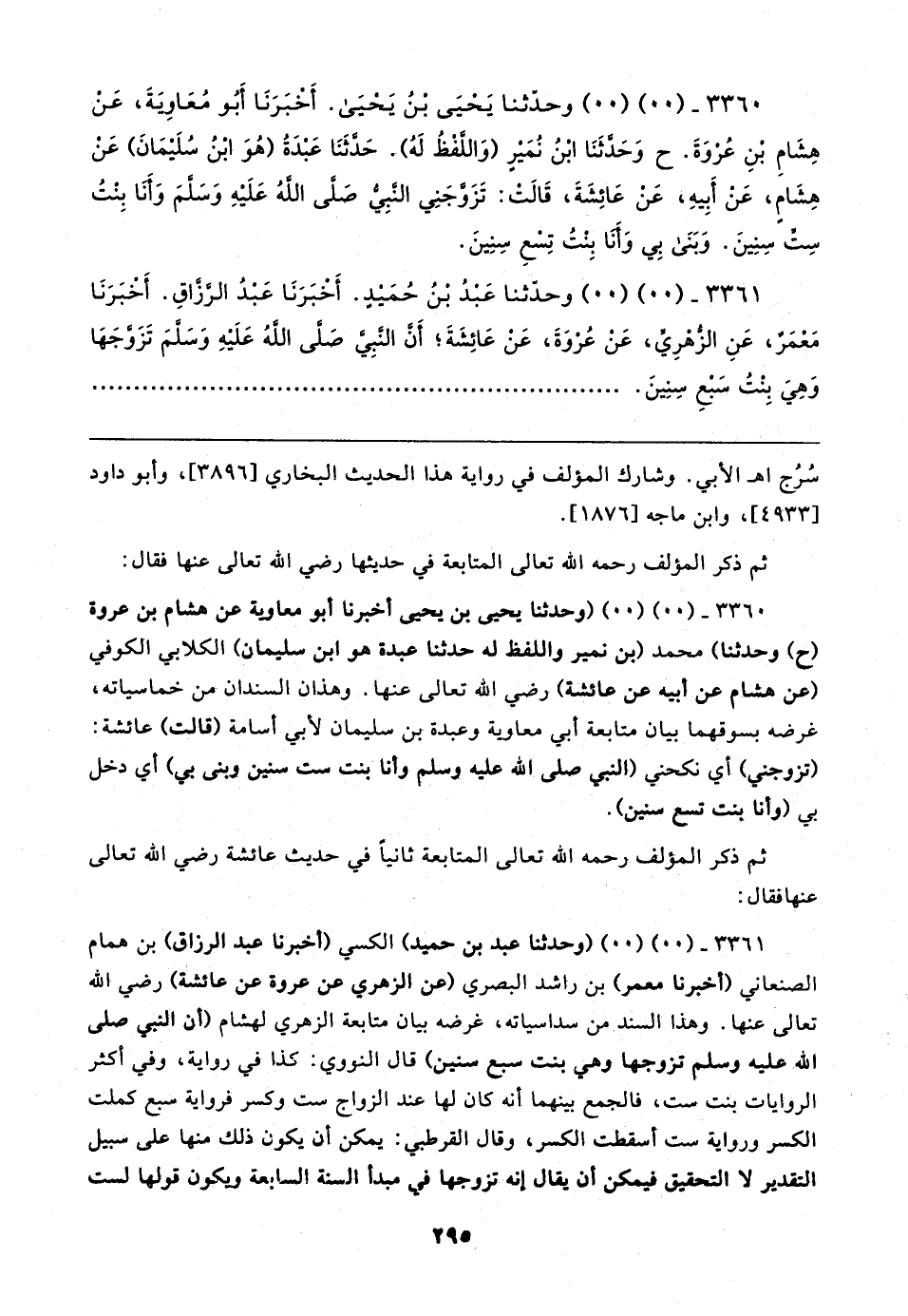٣٣٦٠ - (٠٠) (٠٠) وحدَّثنا يَحْيَى بْنُ يَحْيَى. أَخبَرَنَا أَبُو مُعَاويَةَ، عَنْ هِشَامِ بْنِ عُرْوَةَ. ح وَحَدَّثَنَا ابْنُ نُمَيرٍ (وَاللَّفْظُ لَهُ). حَدَّثَنَا عَبْدَةُ (هُوَ ابْنُ سُلَيمَانَ) عَنْ هِشَامٍ، عَنْ أَبِيهِ، عَنْ عَائِشَةَ، قَالتْ: تَزَوَّجَنِي النَّبِيُّ صَلَّى اللهُ عَلَيهِ وَسَلَّمَ وَأَنَا بِنْتُ سِتِّ سِنِينَ. وَبَنَى بِي وَأنَا بِنْتُ تِسْعِ سِنِينَ.