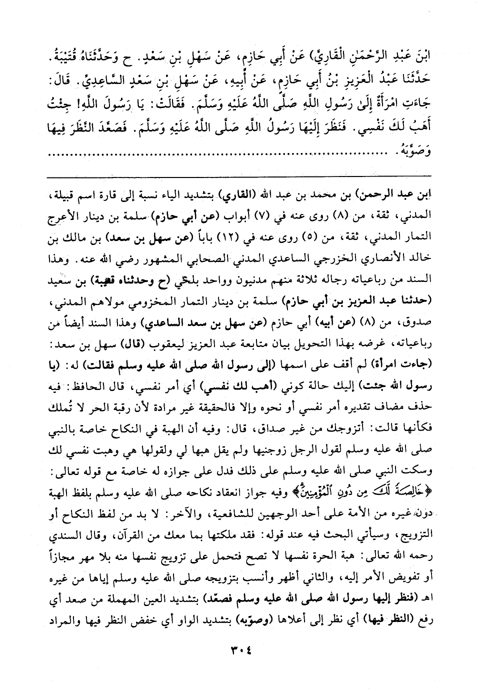 ابن عبد الرحمن) بن محمد بن عبد الله (القاري) بتشديد الياء نسبة إلى قارة اسم قبيلة، المدني، ثقة، من (٨) روى عنه في (٧) أبواب (عن أبي حازم) سلمة بن دينار الأعرج التمار المدني، ثقة، من (٥) روى عنه في (١٢) بابا (عن سهل بن سعد) بن مالك بن خالد الأنصاري الخزرجي الساعدي المدني الصحابي المشهور رضي الله عنه. وهذا السند من رباعياته رجاله ثلاثة منهم مدنيون وواحد بلخي (ح وحدثناه قتيبة) بن سعيد (حدثنا عبد العزيز بن أبي حازم) سلمة بن دينار التمار المخزومي مولاهم المدني، صدوق، من (٨) (عن أبيه) أبي حازم (عن سهل بن سعد الساعدي) وهذا السند أيضًا من رباعياته، غرضه بهذا التحويل بيان متابعة عبد العزيز ليعقوب (قال) سهل بن سعد: (جاءت امرأة) لم أقف على اسمها (إلى رسول الله صلى الله عليه وسلم فقالت) له: (يا رسول الله جئت) إليك حالة كوني (أهب لك نفسي) أي أمر نفسي، قال الحافظ: فيه حذف مضاف تقديره أمر نفسي أو نحوه وإلا فالحقيقة غير مرادة لأن رقبة الحر لا تُملك فكأنها قالت: أتزوجك من غير صداق، قال: وفيه أن الهبة في النكاح خاصة بالنبي صلى الله عليه وسلم لقول الرجل زوجنيها ولم يقل هبها لي ولقولها هي وهبت نفسي لك وسكت النبي صلى الله عليه وسلم على ذلك فدل على جوازه له خاصة مع قوله تعالى: (خَالِصَةً لَكَ مِنْ دُونِ الْمُؤْمِنِينَ) وفيه جواز انعقاد نكاحه صلى الله عليه وسلم بلفظ الهبة دون غيره من الأمة على أحد الوجهين للشافعية، والآخر: لا بد من لفظ النكاح أو التزويج، وسيأتي البحث فيه عند قوله: فقد ملكتها بما معك من القرآن، وقال السندي رحمه الله تعالى: هبة الحرة نفسها لا تصح فتحمل على تزويج نفسها منه بلا مهر مجازًا أو تفويض الأمر إليه، والثاني أظهر وأنسب بتزويجه صلى الله عليه وسلم إياها من غيره اهـ (فنظر إليها رسول الله صلى الله عليه وسلم فصعّد) بتشديد العين المهملة من صعد أي رفع (النظر فيها) أي نظر إلى أعلاها (وصوّبه) بتشديد الواو أي خفض النظر فيها والمراد