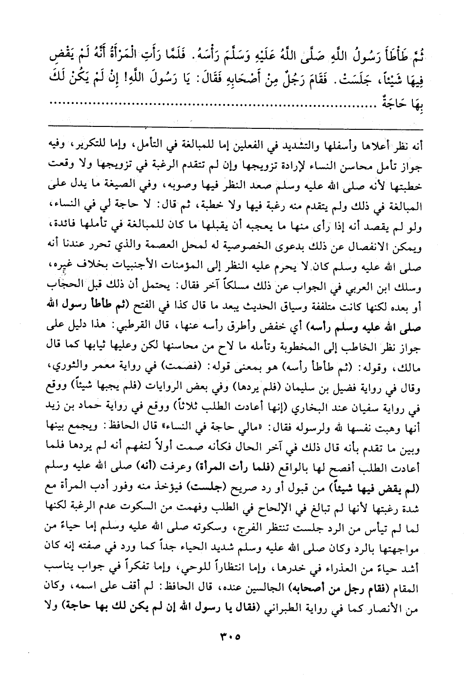 أنه نظر أعلاها وأسفلها والتشديد في الفعلين إما للمبالغة في التأمل، وإما للتكرير، وفيه جواز تأمل محاسن النساء لإرادة تزويجها وإن لم تتقدم الرغبة في تزويجها ولا وقعت خطبتها لأنه صلى الله عليه وسلم صعد النظر فيها وصوبه، وفي الصيغة ما يدل على المبالغة في ذلك ولم يتقدم منه رغبة فيها ولا خطبة، ثم قال: لا حاجة لي في النساء، ولو لم يقصد أنه إذا رأى منها ما يعجبه أن يقبلها ما كان للمبالغة في تأملها فائدة، ويمكن الانفصال عن ذلك بدعوى الخصوصية له لمحل العصمة والذي تحرر عندنا أنه صلى الله عليه وسلم كانا لا يحرم عليه النظر إلى المؤمنات الأجنبيات بخلاف غيره، وسلك ابن العربي في الجواب عن ذلك مسلكًا آخر فقال: يحتمل أن ذلك قبل الحجاب أو بعده لكنها كانت متلففة وسياق الحديث يبعد ما قال كذا في الفتح (ثم طأطأ رسول الله صلى الله عليه وسلم رأسه) أي خفض وأطرق رأسه عنها، قال القرطبي: هذا دليل على جواز نظر الخاطب إلى المخطوبة وتأمله ما لاح من محاسنها لكن وعليها ثيابها كما قال مالك، وقوله: (ثم طأطأ رأسه) هو بمعنى قوله: (فصمت) في رواية معمر والثوري، وقال في رواية فضيل بن سليمان (فلم يردها) وفي بعض الروايات (فلم يجبها شيئًا) ووقع في رواية سفيان عند البخاري (إنها أعادت الطلب ثلاثًا) ووقع في رواية حماد بن زيد أنها وهبت نفسها لله ولرسوله فقال: "ما لي حاجة في النساء" قال الحافظ: ويجمع بينها وبين ما تقدم بأنه قال ذلك في اخر الحال فكأنه صمت أولًا لتفهم أنه لم يردها فلما أعادت الطلب أفصح لها بالواقع (فلما رأت المرأة) وعرفت (أنه) صلى الله عليه وسلم (لم يقض فيها شيئًا) من قبول أو رد صريح (جلست) فيؤخذ منه وفور أدب المرأة مع شدة رغبتها لأنها لم تبالغ في الإلحاح في الطلب وفهمت من السكوت عدم الرغبة لكنها لما لم تيأس من الرد جلست تنتظر الفرج، وسكوته صلى الله عليه وسلم إما حياةً من مواجهتها بالرد وكان صلى الله عليه وسلم شديد الحياء جدًّا كما ورد في صفته إنه كان أشد حياءً من العذراء في خدرها، وإما انتظارًا للوحي، وإما تفكرًا في جواب يناسب المقام (فقام رجل من أصحابه) الجالسين عنده، قال الحافظ: لم أقف على اسمه، وكان من الأنصار كما في رواية الطبراني (فقال يا رسول الله أن لم يكن لك بها حاجة) ولا