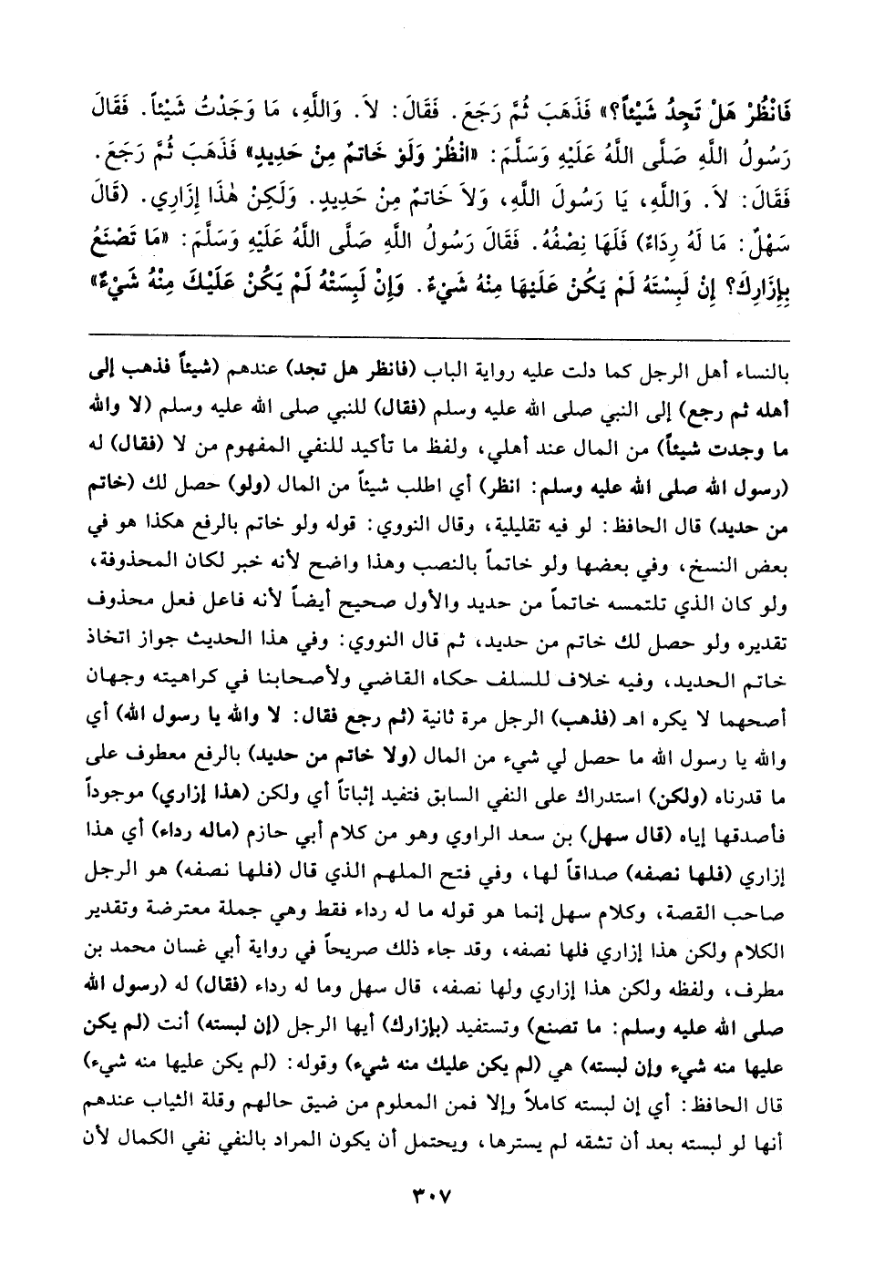 فَانْظُرْ هَلْ تَجِدُ شَيئًا؟ " فَذَهَبَ ثُمَّ رَجَعَ. فَقَال: لَا. وَاللهِ، مَا وَجَدْتُ شَيئًا. فَقَال رَسُولُ اللهِ صَلَّى اللهُ عَلَيهِ وَسَلَّمَ: "انْظُرْ وَلَوْ خَاتمٌ مِنْ حَدِيدٍ" فَذَهَبَ ثُمَّ رَجَعَ. فَقَال: لَا. وَاللهِ، يَا رَسُولَ اللهِ، وَلَا خَاتمٌ مِنْ حَدِيدٍ. وَلَكِنْ هذَا إِزَارِي. (قَال سَهْلٌ: مَا لَهُ رِدَاءٌ) فَلَهَا نِصْفُهُ. فَقَال رَسُولُ اللهِ صَلَّى اللهُ عَلَيهِ وَسَلَّمَ: "مَا تَصْنَعُ بِإزَارِكَ؟ إِنْ لَبِسْتَهُ لَمْ يَكُنْ عَلَيهَا مِنْهُ شَيءٌ. وَإِنْ لَبِسَتْهُ لَمْ يَكُنْ عَلَيكَ مِنْهُ شَيءٌ"