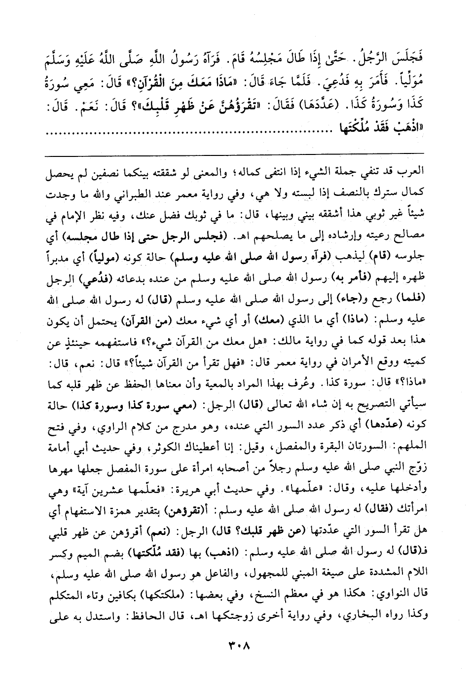 فَجَلَسَ الرَّجُلُ. حَتَّى إِذَا طَال مَجْلِسُهُ قَامَ. فَرَآهُ رَسُولُ اللهِ صَلَّى اللهُ عَلَيهِ وَسَلَّمَ مُوَلِّيًا. فَأمَرَ بِهِ فَدُعِيَ. فَلَمَّا جَاءَ قَال: "مَاذَا مَعَكَ مِنَ الْقُرْآنِ؟ " قَال: مَعِي سُورَةُ كَذَا وَسُورَةُ كَذَا. (عَدَّدَهَا) فَقَال: "تَقْرَؤُهُنَّ عَنْ ظَهْرِ قَلْبِكَ"؟ قَال: نَعَمْ. قَال: "اذْهَبْ فَقَدْ مُلِّكْتَها