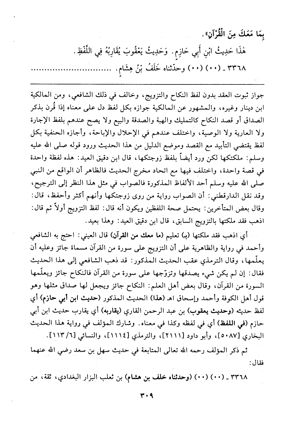 أي اذهب فقد ملكتها (بـ) تعليم (ما معك من القرآن) قال العيني: احتج به الشافعي وأحمد في رواية والظاهرية على أن التزويج على سورة من القرآن مسماة جائز وعليه أن يعلّمها، وقال الترمذي عقب الحديث المذكور: قد ذهب الشافعي إلى هذا الحديث فقال: إن لم يكن شيء يصدقها وتزوّجها على سورة من القرآن فالنكاح جائز ويعلّمها السورة من القرآن، وقال بعض أهل العلم: النكاح جائز ويجعل لها صداق مثلها وهو قول أهل الكوفة وأحمد وإسحاق اهـ (هذا) الحديث المذكور (حديث ابن أبي حازم) أي لفظ حديثه (وحديث يعقوب) بن عبد الرحمن القاري (يقاربه) أي يقارب حديث ابن أبي حازم (في اللفظ) أي في لفظه وكذا في معناه. وشارك المؤلف في رواية هذا الحديث البخاري [٥٠٨٧]، وأبو داود [٢١١١]، والترمذي [١١١٤]، والنسائي [١١٣/ ٦].