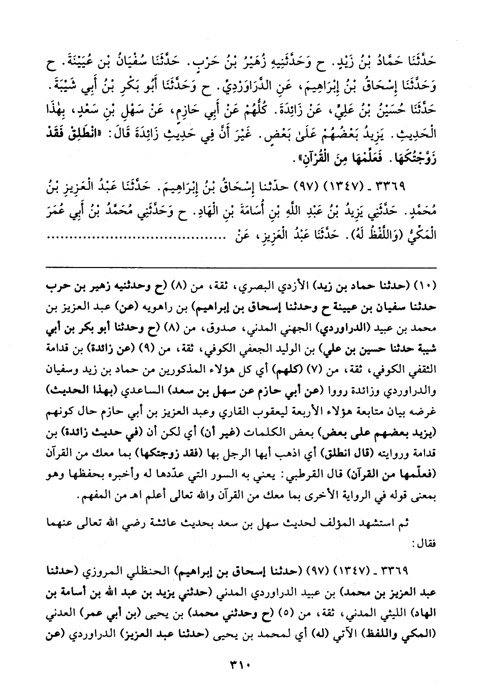 حَدَّثَنَا حَمَّادُ بْنُ زَيدٍ. ح وَحَدَّثَنِيهِ زُهَيرُ بْنُ حَرْب. حَدَّثَنَا سُفْيَانُ بن عُيَينَةَ. ح وَحَدَّثَنَا إِسْحَاقُ بْنُ إِبْرَاهِيمَ، عَنِ الدَّرَاوَرْدِيِّ. ح وَحَدَّثَنَا أَبُو بَكرِ بْنُ أَبِي شَيبَةَ. حَدَّثَنَا حُسَينُ بْنُ عَلِيٍّ، عَنْ زَائِدَةَ. كُلُّهُمْ عَنْ أَبِي حَازِمٍ، عَنْ سَهْلِ بْنِ سَعْدٍ، بِهذَا الْحَدِيثِ. يَزِيدُ بَعْضُهُمْ عَلَى بَعْضٍ. غَيرَ أَنَّ فِي حَدِيثِ زَائِدَةَ قَال: "انْطَلِق فَقَدْ زَوَّجْتُكَهَا. فَعَلَّمْهَا مِنَ الْقُرْآنِ".